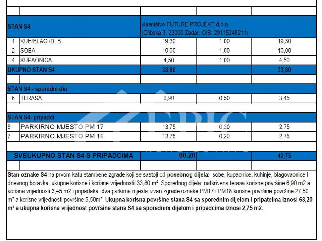 Квартира с обозначением S2, расположенная на первом этаже здания с восемью жилыми единицами, состоит из кухни с обеденной зоной и гостиной, спальни, ванной комнаты и крытой террасы. К квартире также прилагаются два парковочных места. Общая полезная площадь квартиры S2 с подсобными помещениями и принадлежностями составляет 118,60 м2, а общая полезная жилая площадь квартиры — 47,95 м2.