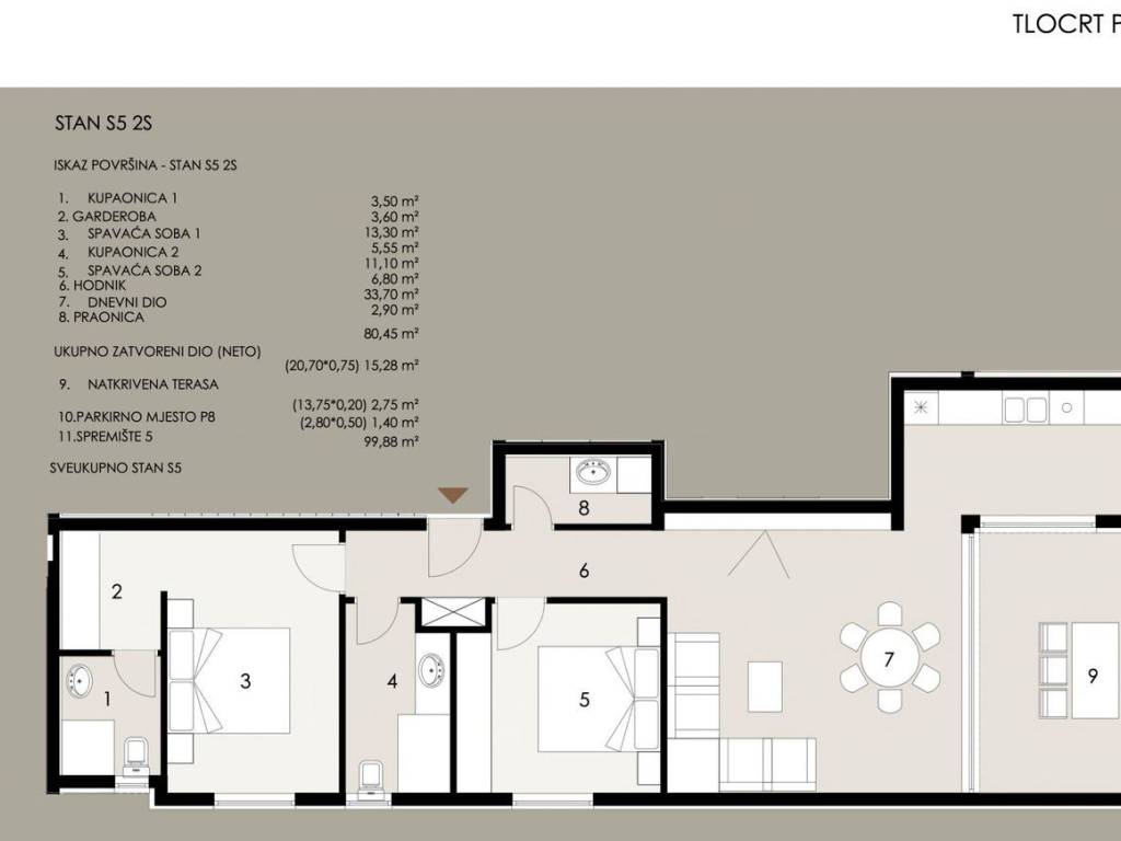 Stan S5 – prvi kat, ukupne površine 99,88 m², sastoji se od: hodnika, dvije kupaonice, dvije spavaće sobe, prostranog dnevnog boravka s kuhinjom i blagovaonicom u otvorenom konceptu, praonice i natkrivene terase.