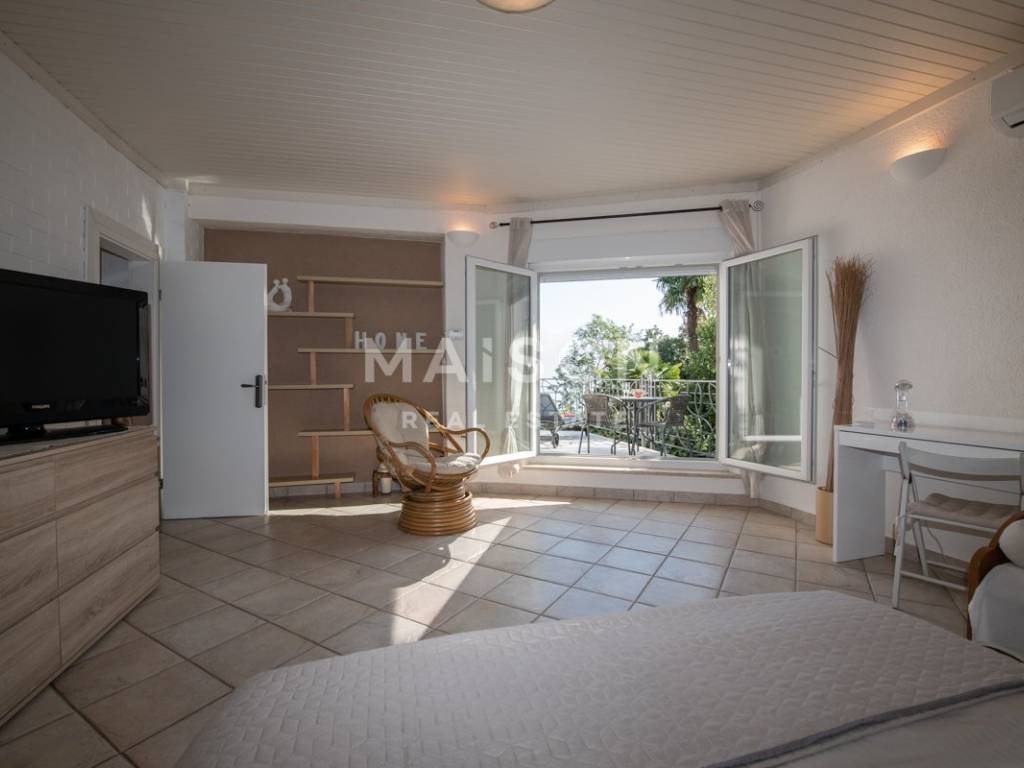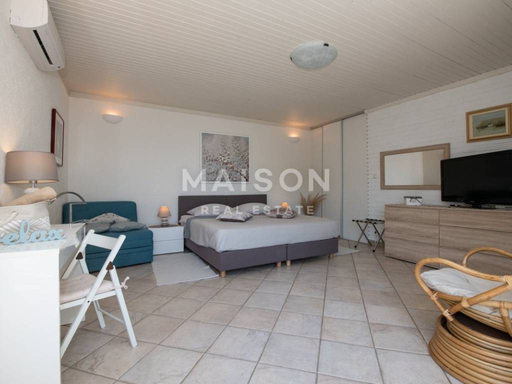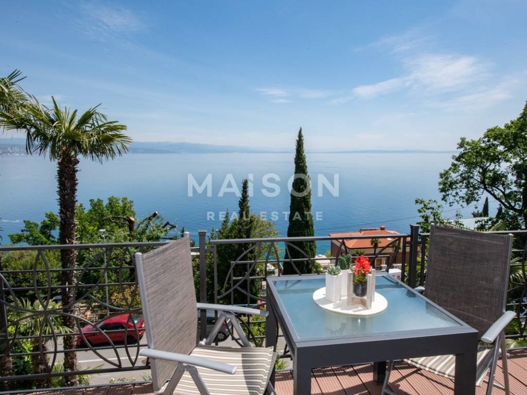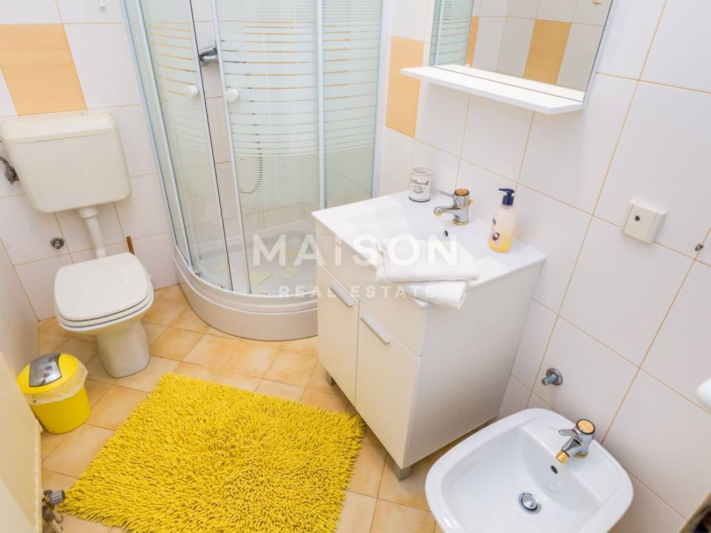 The apartment is located on the first floor of a house and offers a spacious and functional layout. It consists of three bedrooms, two of which are larger, three bathrooms, a large kitchen with an adjoining storage room, as well as two balconies and a veranda. A key feature of the apartment is the balcony accessed from the living room, which offers a magnificent open sea view. The second balcony is located on the southern side of the kitchen, while the northern exit from the kitchen leads to a covered veranda, ideal for outdoor living. The apartment is equipped with air conditioning units in the living room and one bedroom and stands out for its attractive sea view and well-designed outdoor spaces.