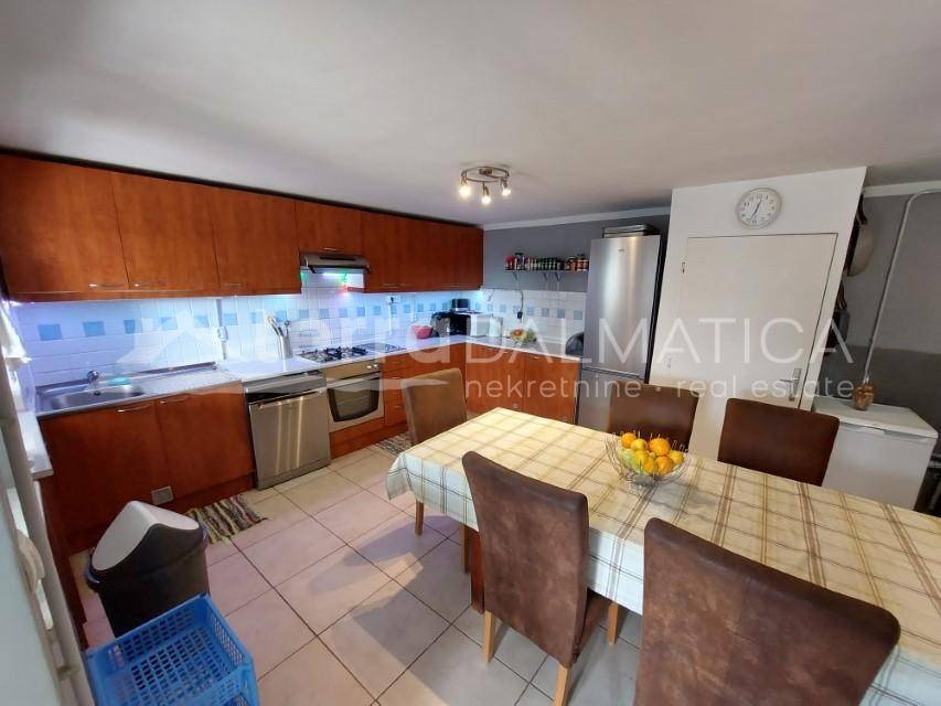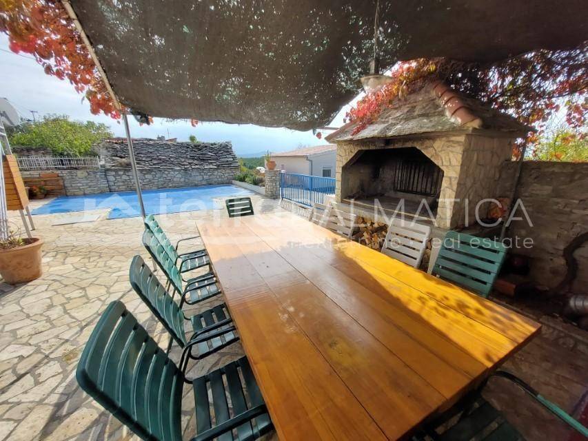 For sale in Dubravice charming country house with pool, beautiful courtyard, blue shutters. It is located on a hill, with a panoramic view of Dubravice, beautiful nature. It is ina a place that is practically part of the Krka National Park, a step away from the beautiful walkways, belvederes that surround the karst beauty, the river Krka. It offers peace, a rural idyll, and yet it is close to everything. A few km to the town of Skradin, highway, about 20 minutes to Sibenik. It is suitable for tourist rental, investment property. The house is nicely furnished, air conditioned, has central heating that allows a comfortable stay in the winter months. The beautifully decorated courtyard of the house is surrounded by a stone wall and includes a barbecue, a large table covered with a pergola, a swimming pool and a covered terrace with beautiful garden furniture. There is a heater on the terrace so that you can stay on it even on colder days. It consists of ground floor and first floor, has four bedrooms plus a guest studio apartment upstairs which has a separate entrance from the back of the house. On the ground floor of the house is the living area of ​​the open space concept, bathroom and one bedroom, while on the first floor are three bedrooms, bathroom.