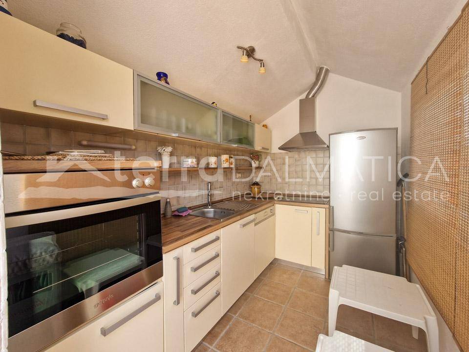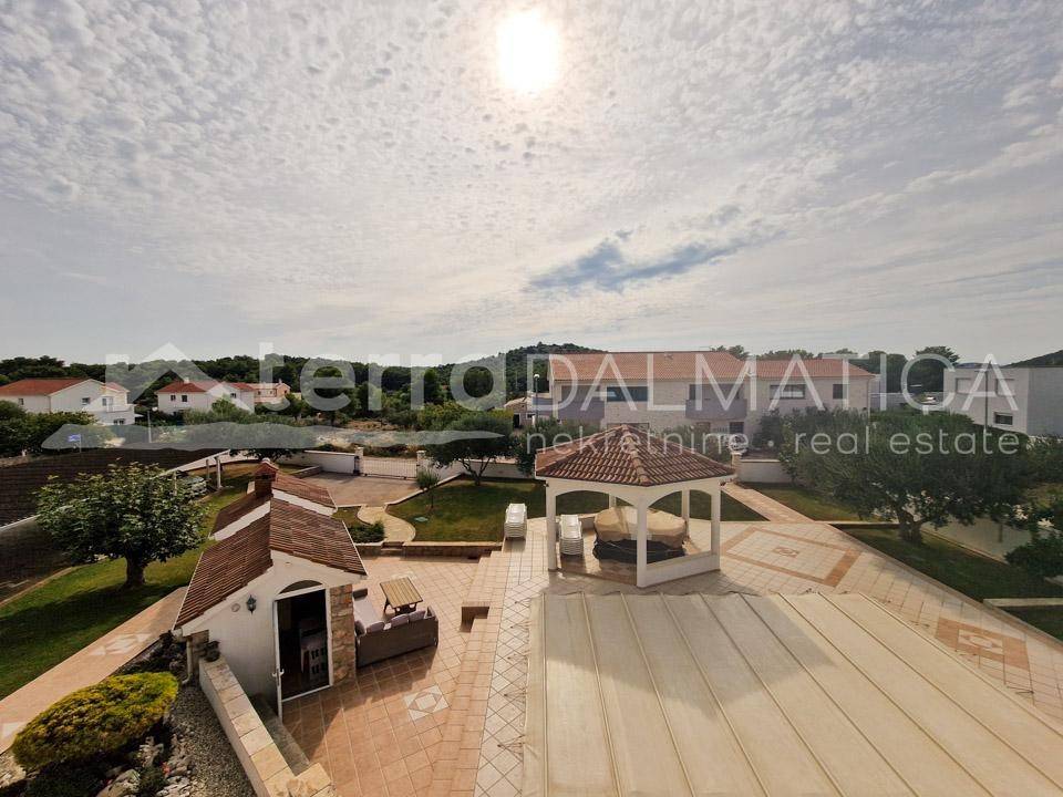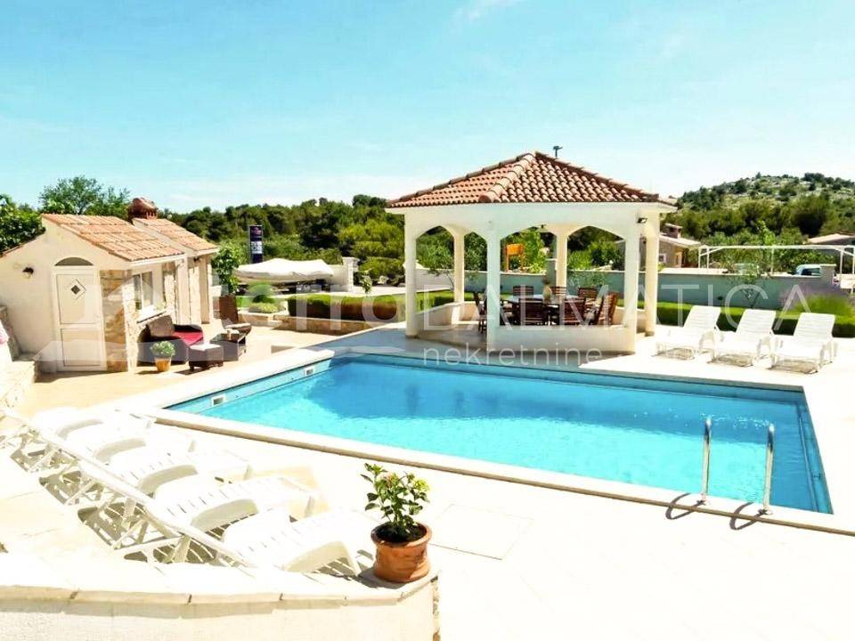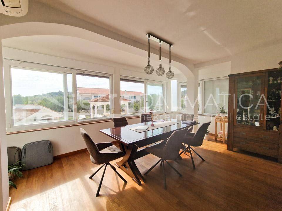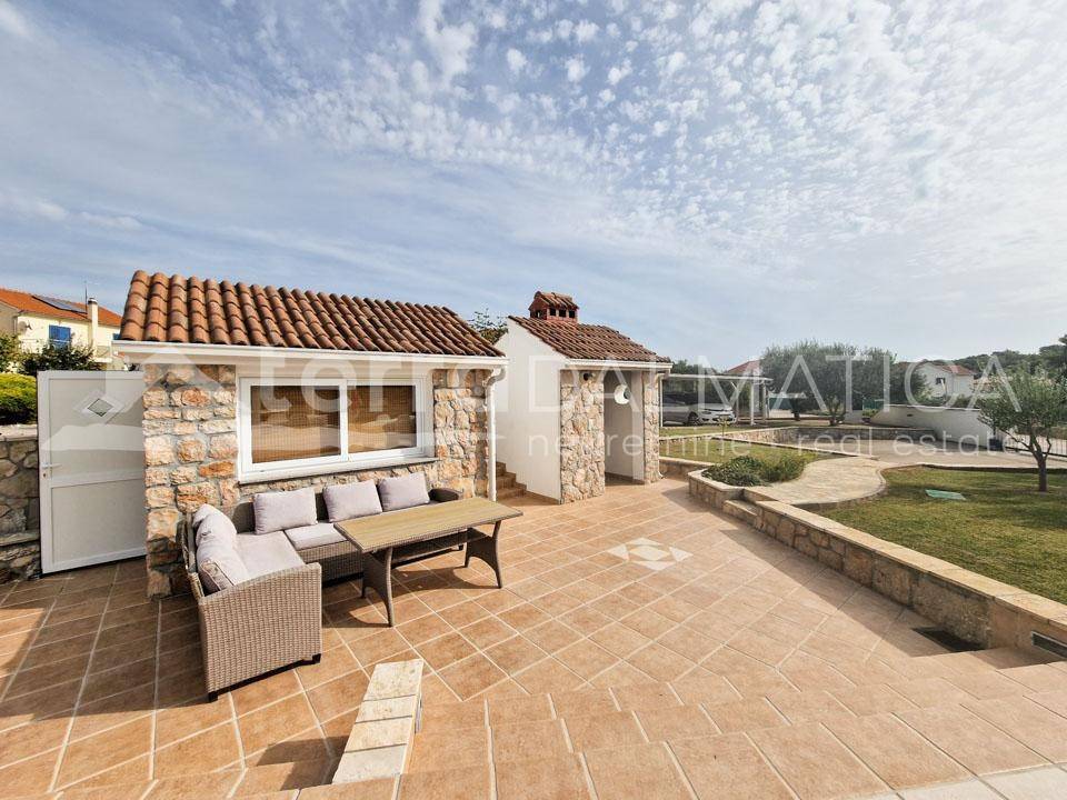 A spacious house with apartments and a large garden is for sale in Tribunj. It is located in a quiet area, in the neighborhood where new builds predominate. The beach in Sovlje bay is only a few minutes' walk away. The house is divided into a comfortable part that is used for private purposes and six apartments that are used for tourist rental. The private apartment consists of a living area of ​​100 m2 and a fully furnished basement of 160 m2. In the residential part there is an open-concept kitchen, dining room and living room, as well as two bedrooms, a bathroom and a study. Top-quality materials and equipment were used in the decoration of the apartment, and in particular we can single out underfloor heating, kitchen fronts made of tempered glass, teak floor coverings and top-quality Italian ceramics. The apartment leads down to a large basement where there is a wellness area (sauna), three bedrooms, a bathroom, a laundry room, a storage room and a boiler room. Given the size of the basement, the future owner can add other facilities, such as a gym, etc. The external stairs lead to six fully equipped apartments with one or two bedrooms. In the yard there is a large swimming pool of 40 m2, a sunbathing area, a shower, a gazebo with a large dining table, a fully equipped summer kitchen, a barbecue and parking for 10 cars. The green areas are beautifully maintained and planted with various Mediterranean flowers and trees. Tribunj is a small fishing village with a special Dalmatian charm. It is a great location for a family vacation, and it is also popular among boaters because of the marina located in the center of the town. Contact our agent and schedule your tour.