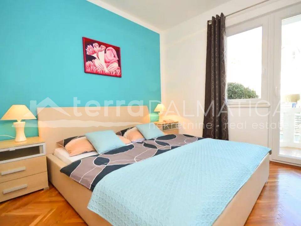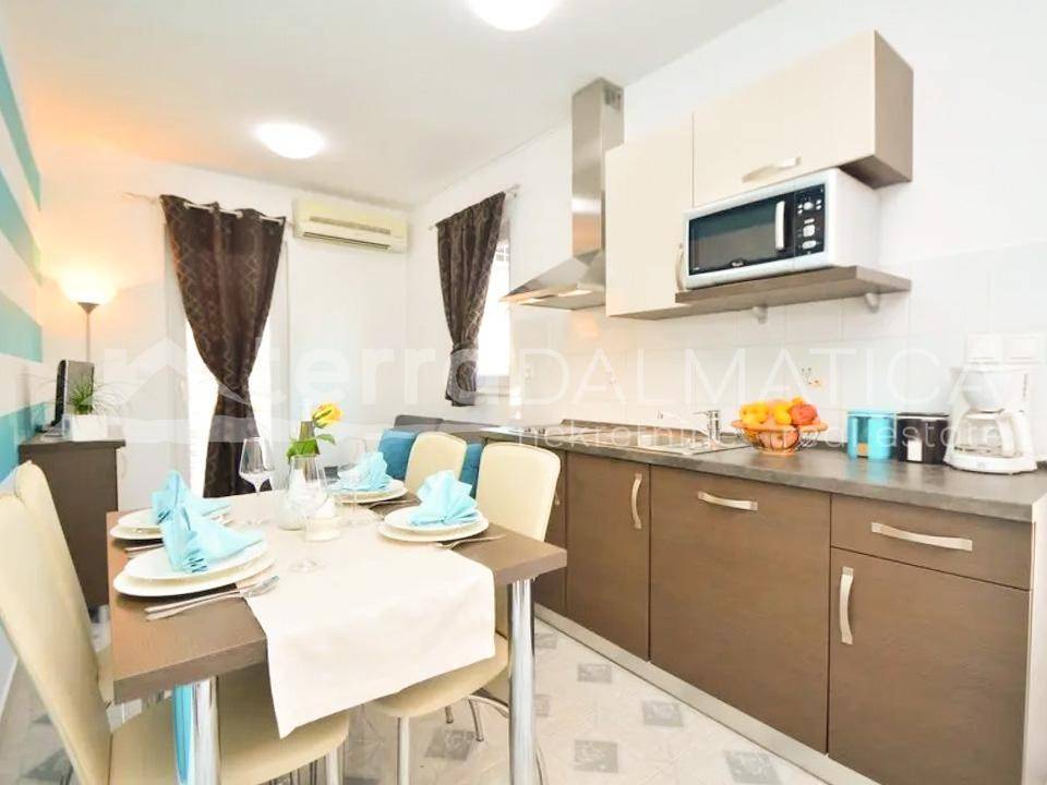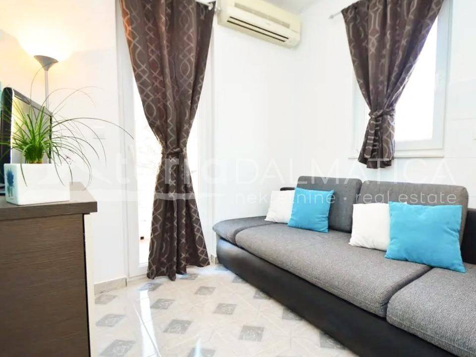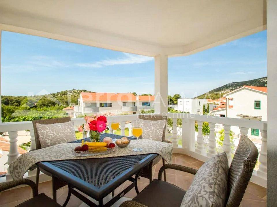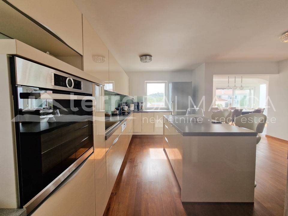 A spacious house with apartments and a large garden is for sale in Tribunj. It is located in a quiet area, in the neighborhood where new builds predominate. The beach in Sovlje bay is only a few minutes' walk away. The house is divided into a comfortable part that is used for private purposes and six apartments that are used for tourist rental. The private apartment consists of a living area of ​​100 m2 and a fully furnished basement of 160 m2. In the residential part there is an open-concept kitchen, dining room and living room, as well as two bedrooms, a bathroom and a study. Top-quality materials and equipment were used in the decoration of the apartment, and in particular we can single out underfloor heating, kitchen fronts made of tempered glass, teak floor coverings and top-quality Italian ceramics. The apartment leads down to a large basement where there is a wellness area (sauna), three bedrooms, a bathroom, a laundry room, a storage room and a boiler room. Given the size of the basement, the future owner can add other facilities, such as a gym, etc. The external stairs lead to six fully equipped apartments with one or two bedrooms. In the yard there is a large swimming pool of 40 m2, a sunbathing area, a shower, a gazebo with a large dining table, a fully equipped summer kitchen, a barbecue and parking for 10 cars. The green areas are beautifully maintained and planted with various Mediterranean flowers and trees. Tribunj is a small fishing village with a special Dalmatian charm. It is a great location for a family vacation, and it is also popular among boaters because of the marina located in the center of the town. Contact our agent and schedule your tour.