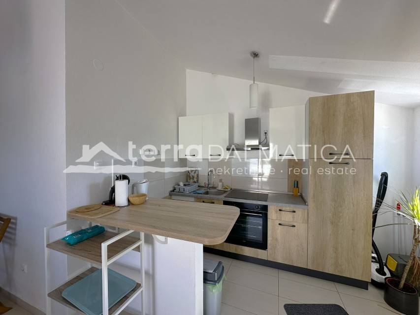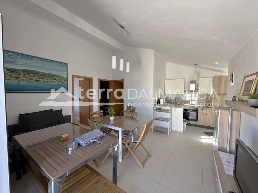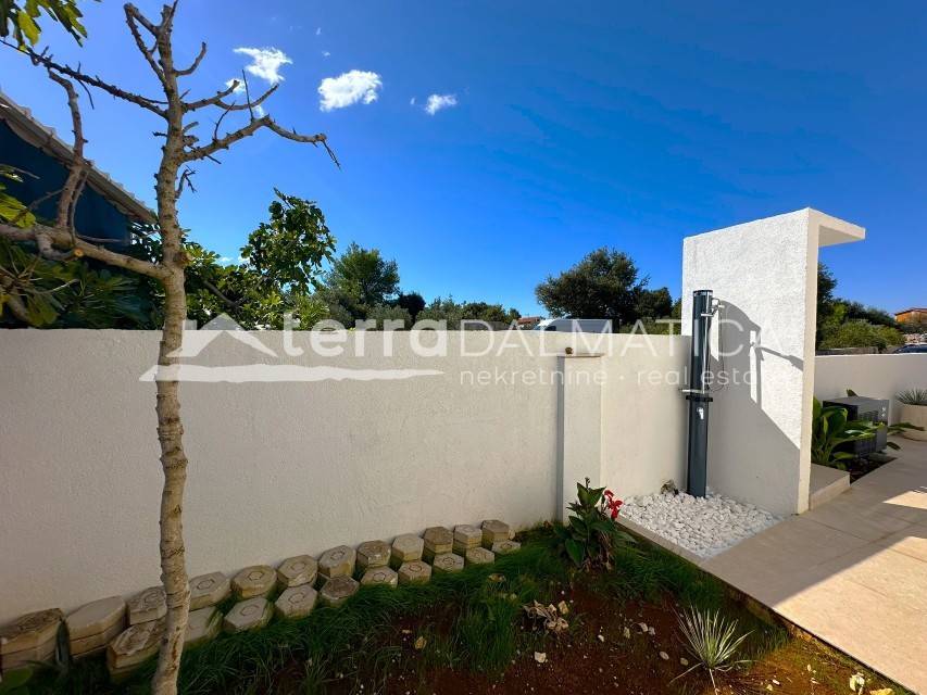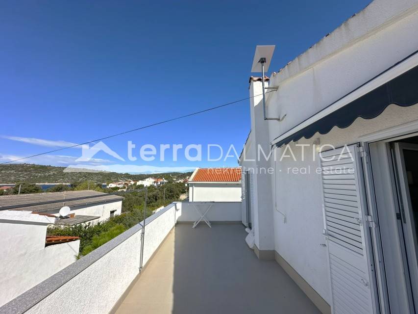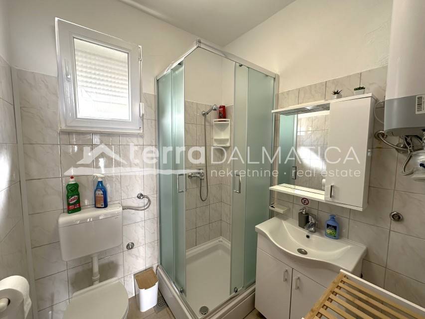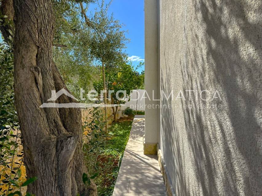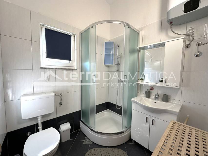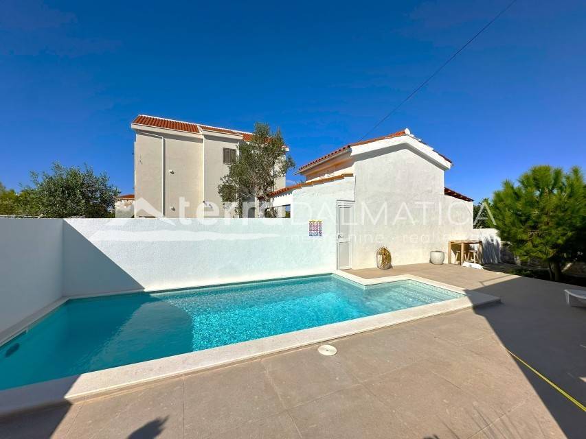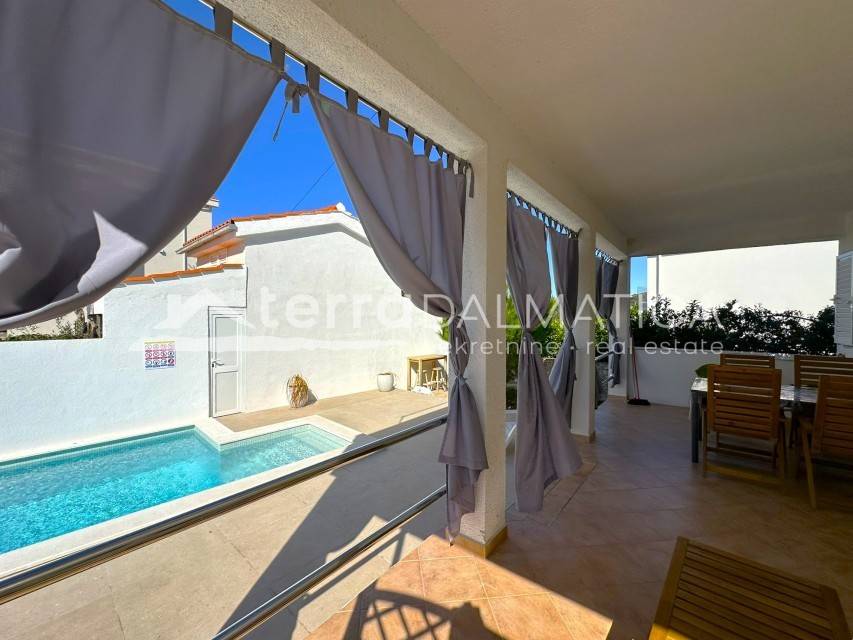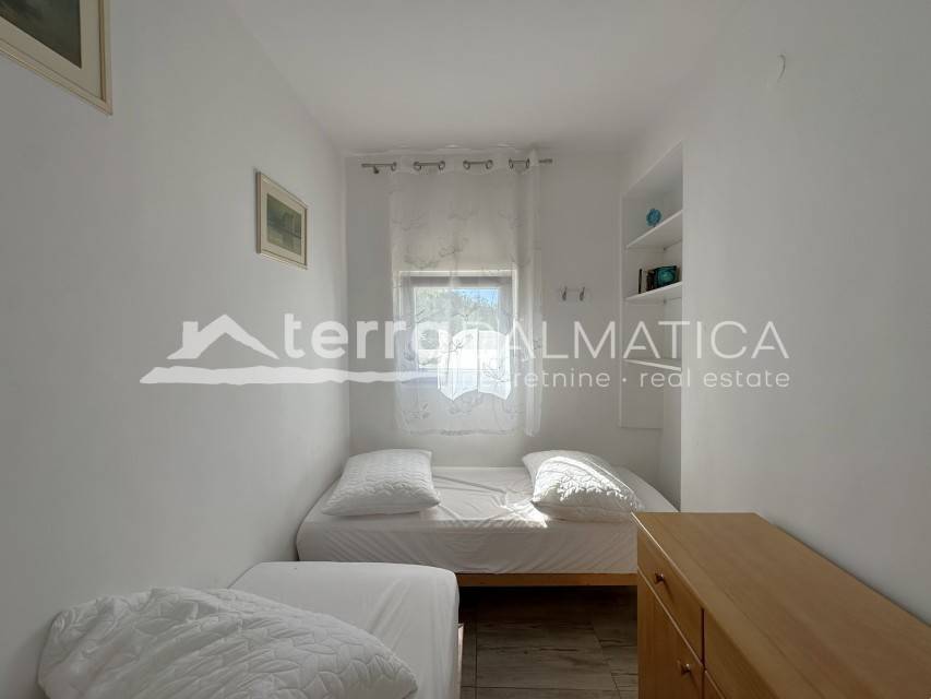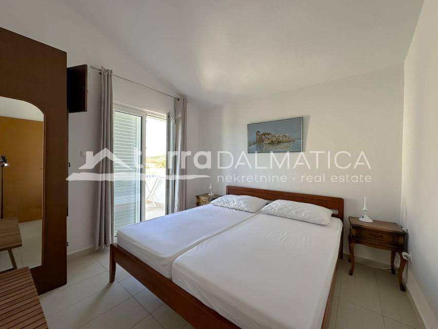 In Kanica, just 150 meters from the sea and near Rogoznica, a 113 square meter house with two apartments and a heated swimming pool is for sale. It is located in a quiet location, just a two-minute walk from the beach. The house consists of a ground floor and an upper floor. On the ground floor there is a two-bedroom apartment with a covered terrace of 22 m², and consists of a bathroom, two bedrooms, a separate kitchen and a living room and dining room in an open concept. On the upper floor there is another two-bedroom apartment with a spacious terrace with a beautiful view of the sea. It consists of a kitchen, dining room, living room, bathroom and two bedrooms. In the yard there is a barbecue and a small auxiliary building converted into a summer kitchen with a northern and southern terrace, and a special value of the property is given by the heated swimming pool for enjoyment throughout the season. Four parking spaces are also provided along the access road. This house is the perfect choice for those who want peace and escape from the city bustle, but also proximity to all amenities. Kanica is located in the bay of the same name, just 4 km from Rogoznica, which offers a diverse tourist and catering offer and one of the most famous marinas on the Adriatic - Marina Frapa. The airport and the city of Trogir are only a 40-minute drive away, while Split is approximately 50 km away. For all additional information and sightseeing, please contact our agent.