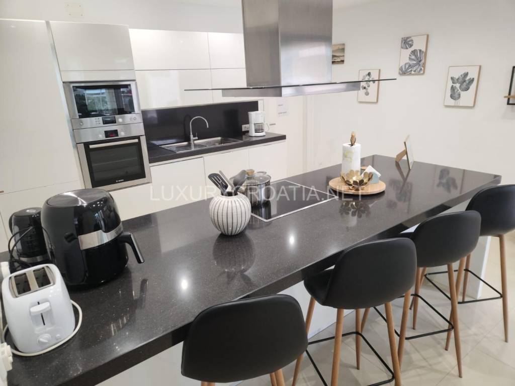 Since villa itself is located high above the sea, it provides a lot of privacy on the terraces and a pool. On the ground floor of 110m2, there is a modern, fully equipped kitchen with a dining room and a living room, from which there is access to a partially covered terrace with a 20 m2 swimming pool, a large outdoor fireplace for grilling and a dining area. Large glass walls offer an open view of the sea.