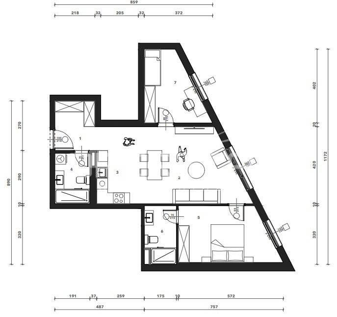 Sastoji se od ulaznog hodnika, kuhinje s blagovaonicom i dnevnog boravka, 2 spavaće sobe i dvije kupaonice. Uz stan je potrebno kupiti garažno mjesto i spremište.