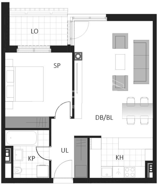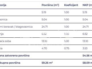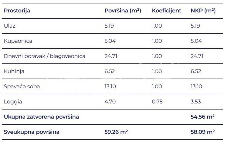 Prostrani dvosobni stan sastoji se od spavaće sobe, kupaonice, hodnika, dnevni boravak s kuhinjom i blagovaonicom te loggie.