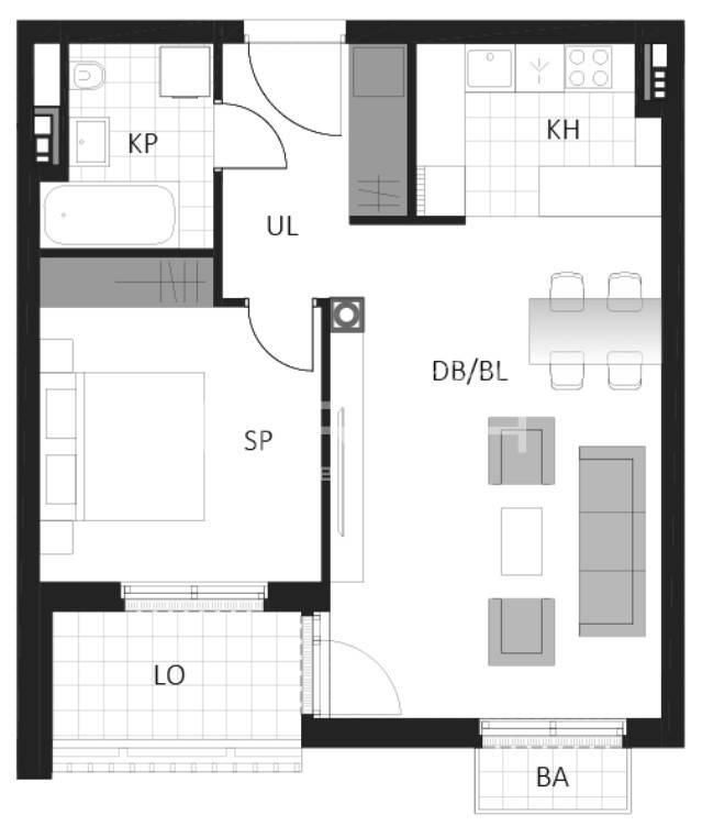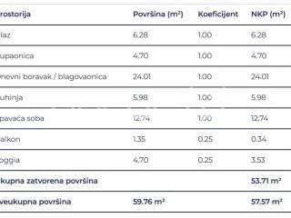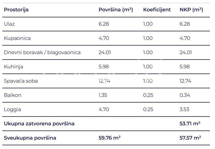 Prostrani dvosobni stan sastoji se od spavaće sobe, kupaonice, hodnika, dnevnog boravka s kuhinjom i blagovaonicom, loggie i balkona.
