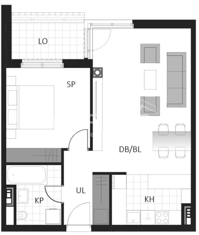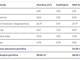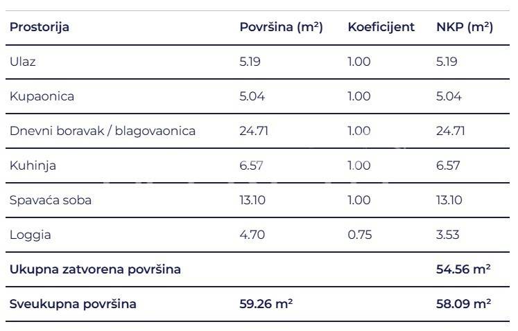Prostrani dvosobni stan sastoji se od spavaće sobe, kupaonice, hodnika, dnevni boravak s kuhinjom i blagovaonicom te loggie.