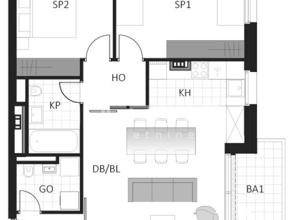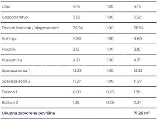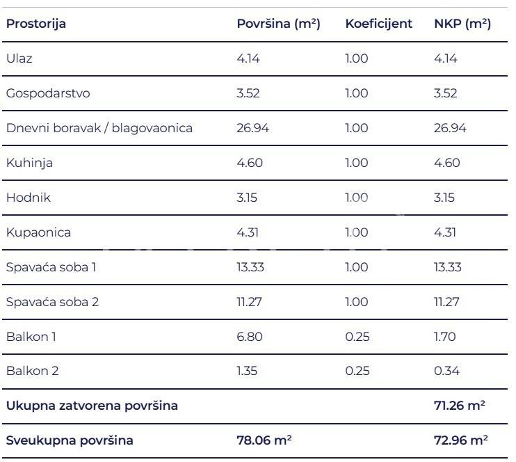 Prostrani trosobni stan sastoji se od dvije spavaće sobe od kojih jedna s balkonom, dvije kupaonice, hodnika, ostave, kuhinje s blagovaonicom i dnevnim boravkom te izlazom na veliki balkon.