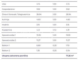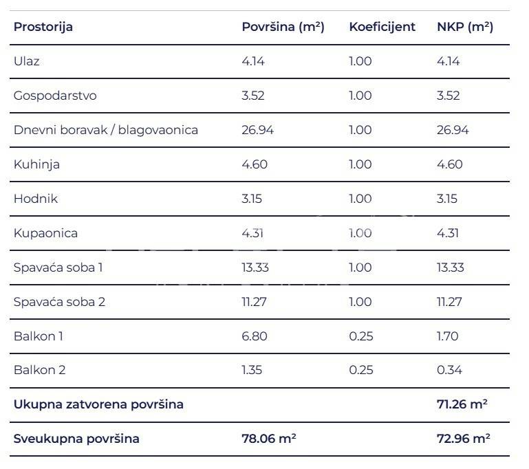 Prostrani trosobni stan sastoji se od dvije spavaće sobe od kojih jedna s balkonom, dvije kupaonice, hodnika, ostave, kuhinje s blagovaonicom i dnevnim boravkom te izlazom na veliki balkon.