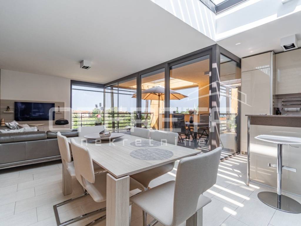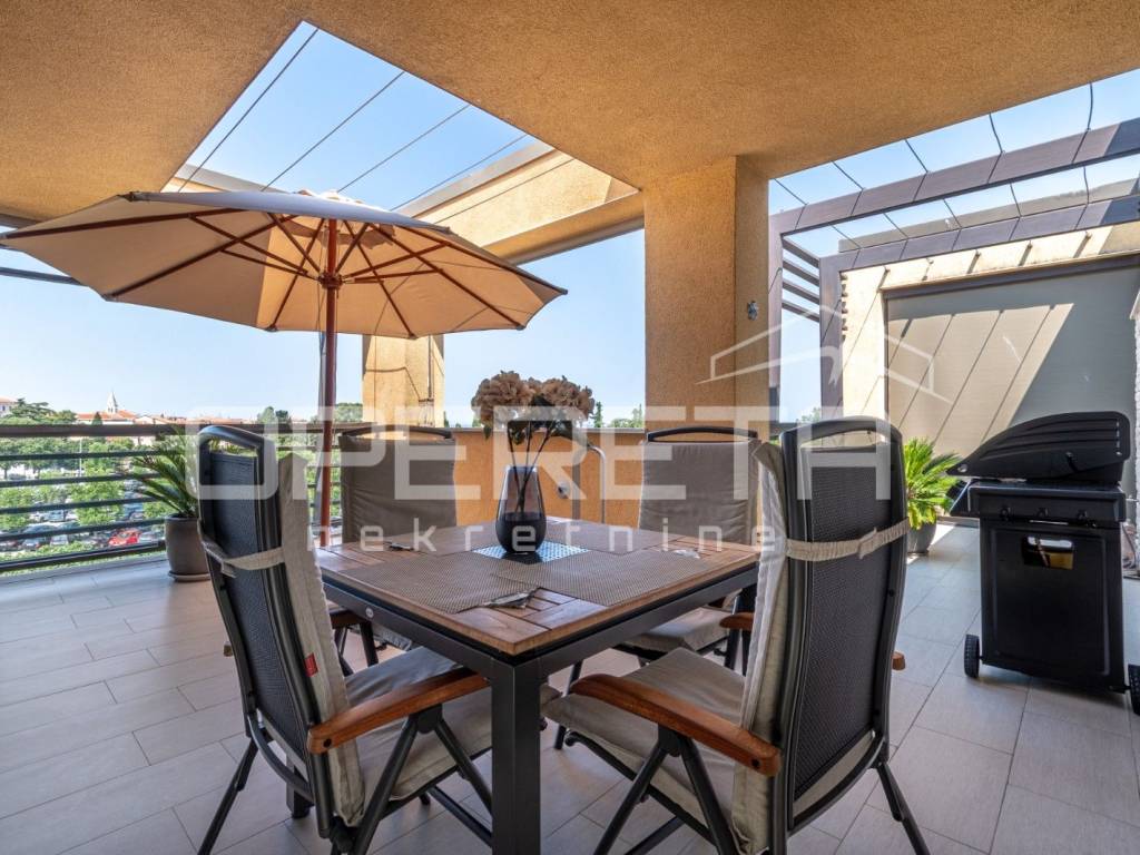 This spacious and modern penthouse, spanning 110 m, is situated in one of the most desirable locations in Poreč, just a few steps from the sea and all essential city amenities. It presents an ideal opportunity for family living, a luxurious holiday, or as a smart investment for tourist rental.