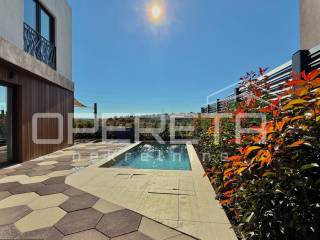 The design style is modern, yet integrated with Mediterranean colors, which is especially evident in the courtyard where the intimacy of bathing in the pool will be complemented by lush vegetation.