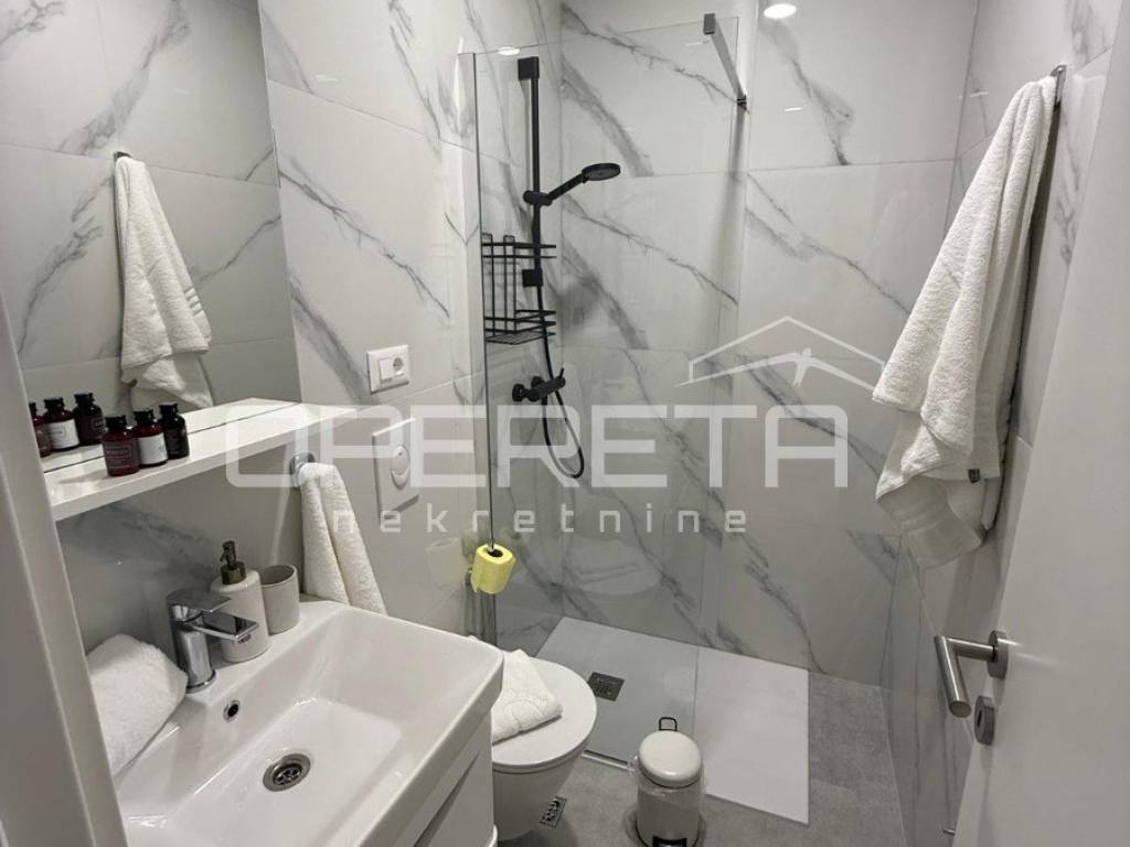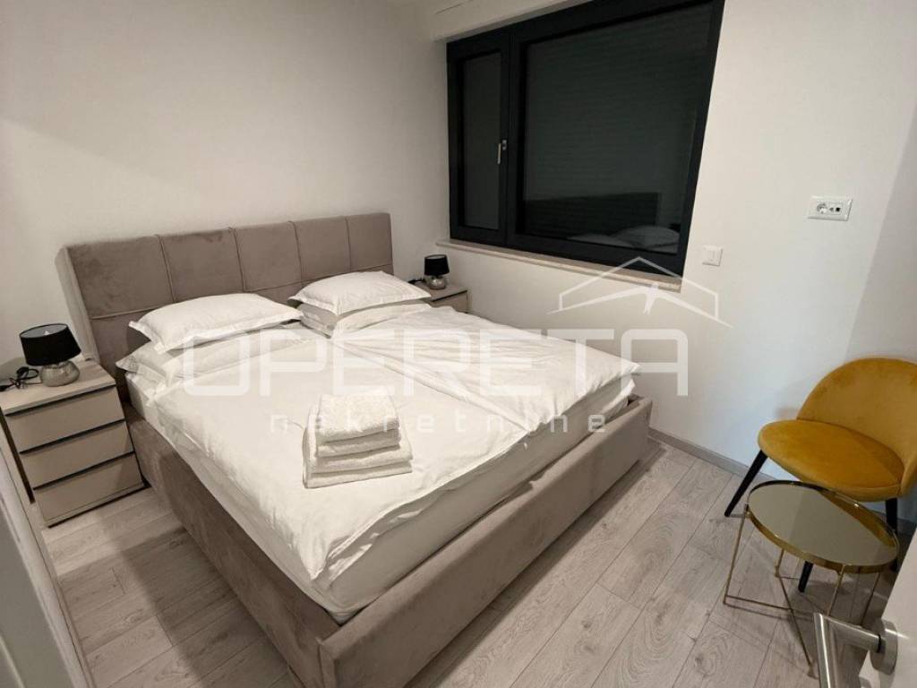 Its layout includes a spacious living room connected to the dining area and kitchen, two elegant bedrooms with en-suite bathrooms, and a terrace offering stunning sea views. The price includes complete furniture, carefully selected to perfectly match the space, enabling new owners to move in without additional investments. The apartment is equipped with air conditioning units in all rooms, ensuring maximum comfort year-round. The garage spot is connected to an elevator that leads directly to the apartment, providing extra convenience and security.