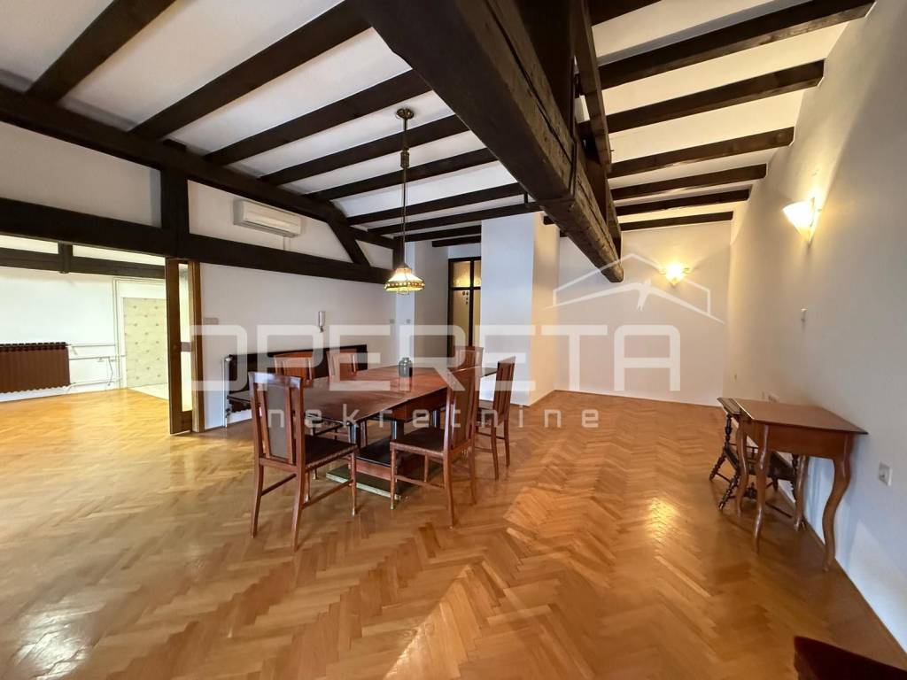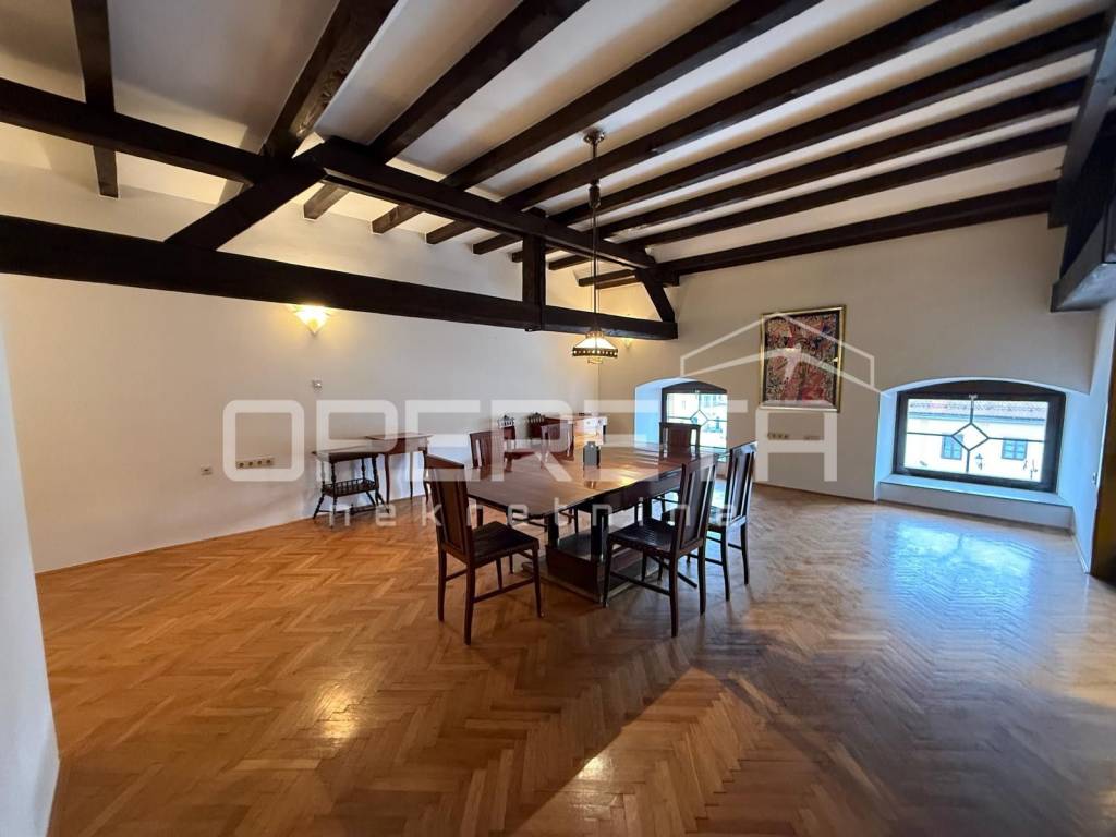 This expansive property, totaling 231 m (215 m net floor area), spans the first floor and the high attic of a historic building. While the property has been completely structurally renovated and partitioned, the interior has been intentionally left unfurnished.