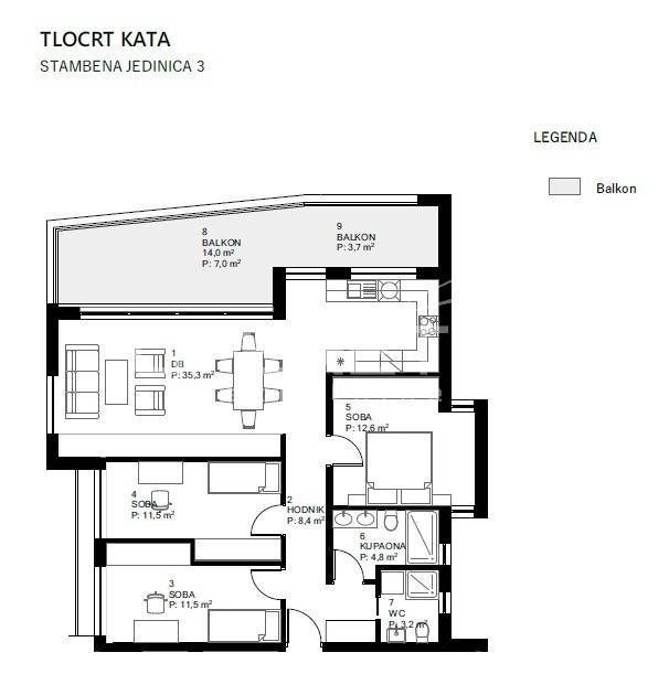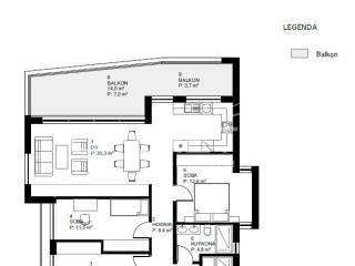 Kvadratura stana: 100,50 m2 Kvadratura balkona: 21,4 m2 Broj spavaćih soba: 3 Broj kupaonica: 2