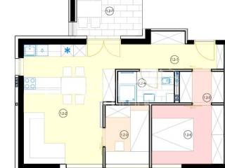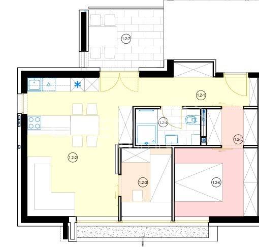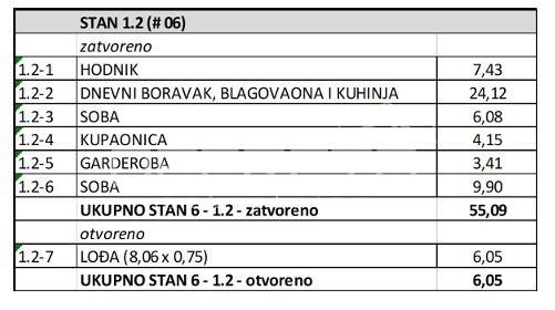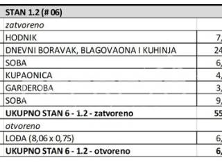 Stan oznake S6 nalazi se na 1. katu stambene zgrade u izgradnji od ukupno 2 kata. Sastoji se od velikog "open space" dnevnog boravka s kuhinjom i blagovaonicom te izlazom na lođu, 2 sobe, kupaonice s wc-om, zasebne garderobe i hodnika.