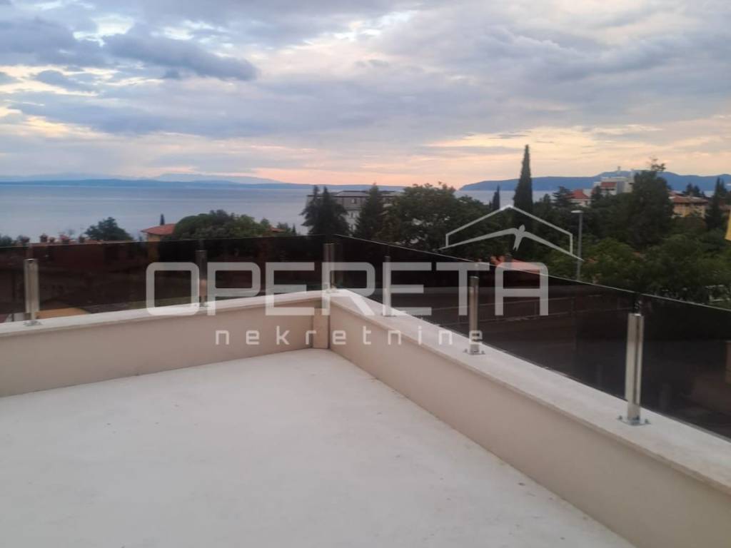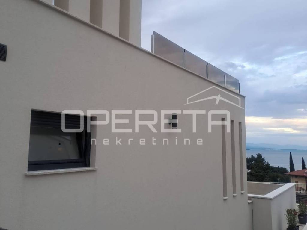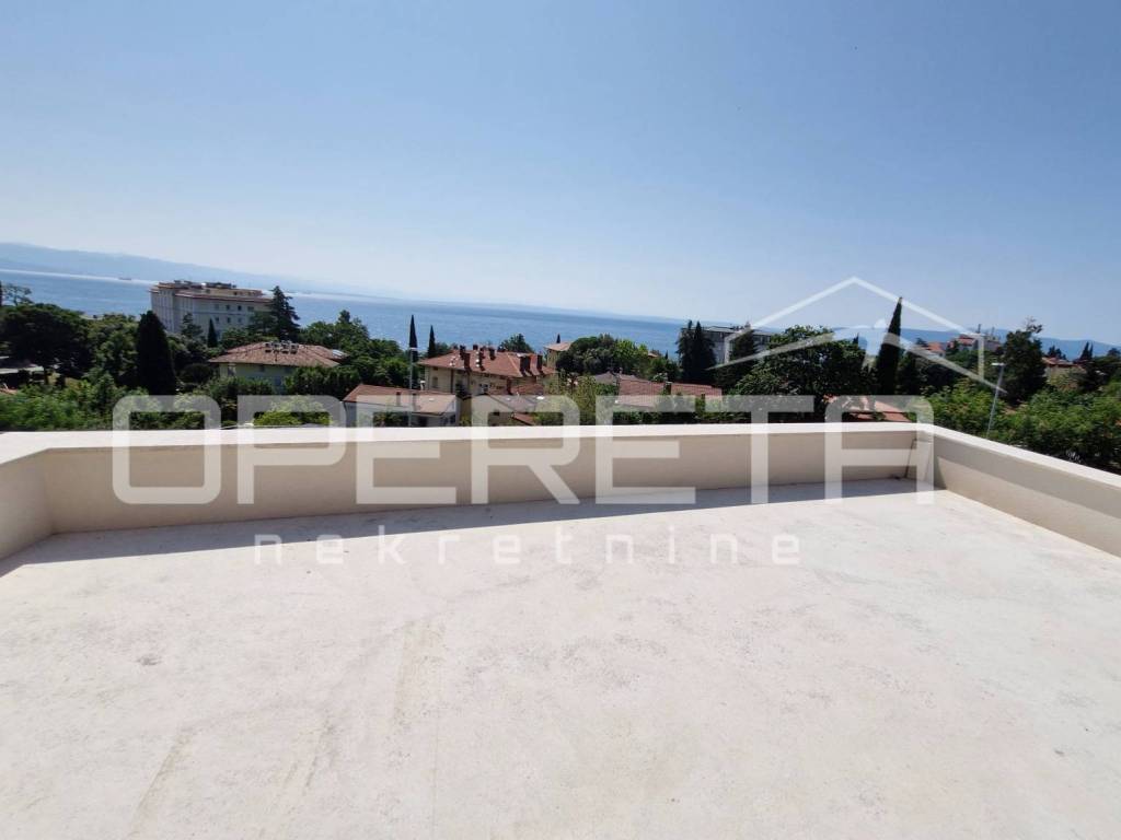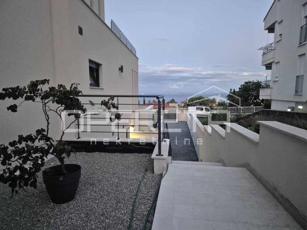 Located in the center of Lovran, this elegant 140m ground-floor apartment offers panoramic sea views, two master bedrooms with en-suite bathrooms, a third room, and an additional bathroom. Direct access to a private terrace, saltwater pool, and sun deck. Sold in advanced shell condition allowing customization. High-efficiency heat pump system, private parking, and 15m storage. Only minutes from the sea and all local amenities.