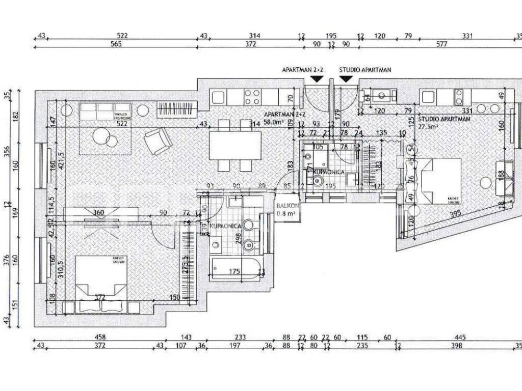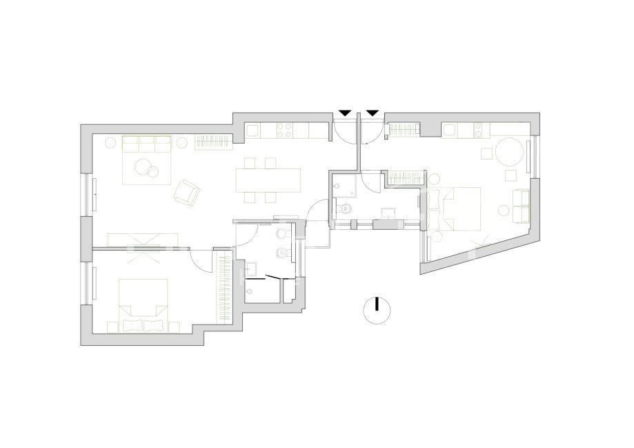 Sastoji se od ulaznog prostora, kupaonice i openspace prostorom za spavaći i dnevni dio s kuhinjom.