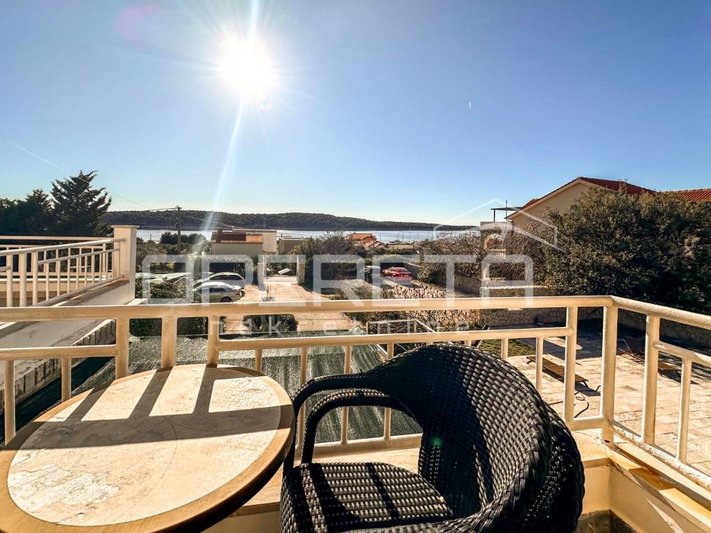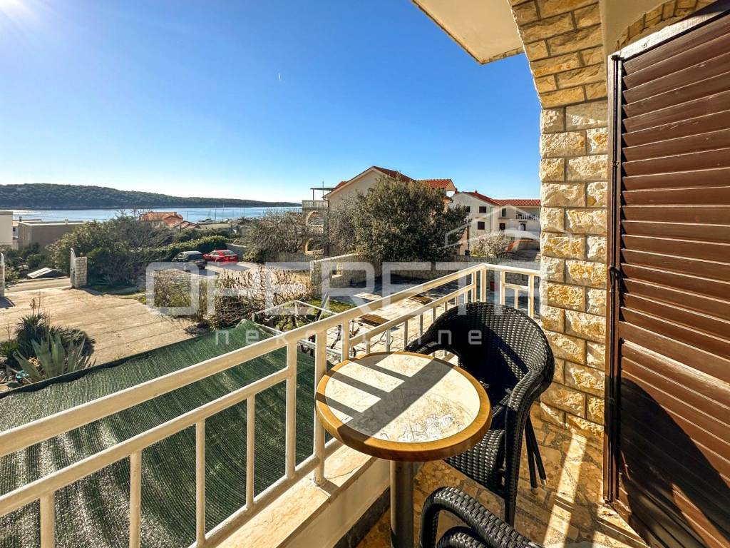 Stairs lead to the first floor, which features two apartments one accommodating 4-6 people (two bedrooms, a bathroom, kitchen, living room, and a large terrace) and another for 4 people (two bedrooms, a bathroom, kitchen, and balcony) offering a stunning sea view. The second floor has an apartment for 8-10 people, which can be divided into two smaller units if needed. Each room has a bathroom, and most of the space enjoys a sea view.