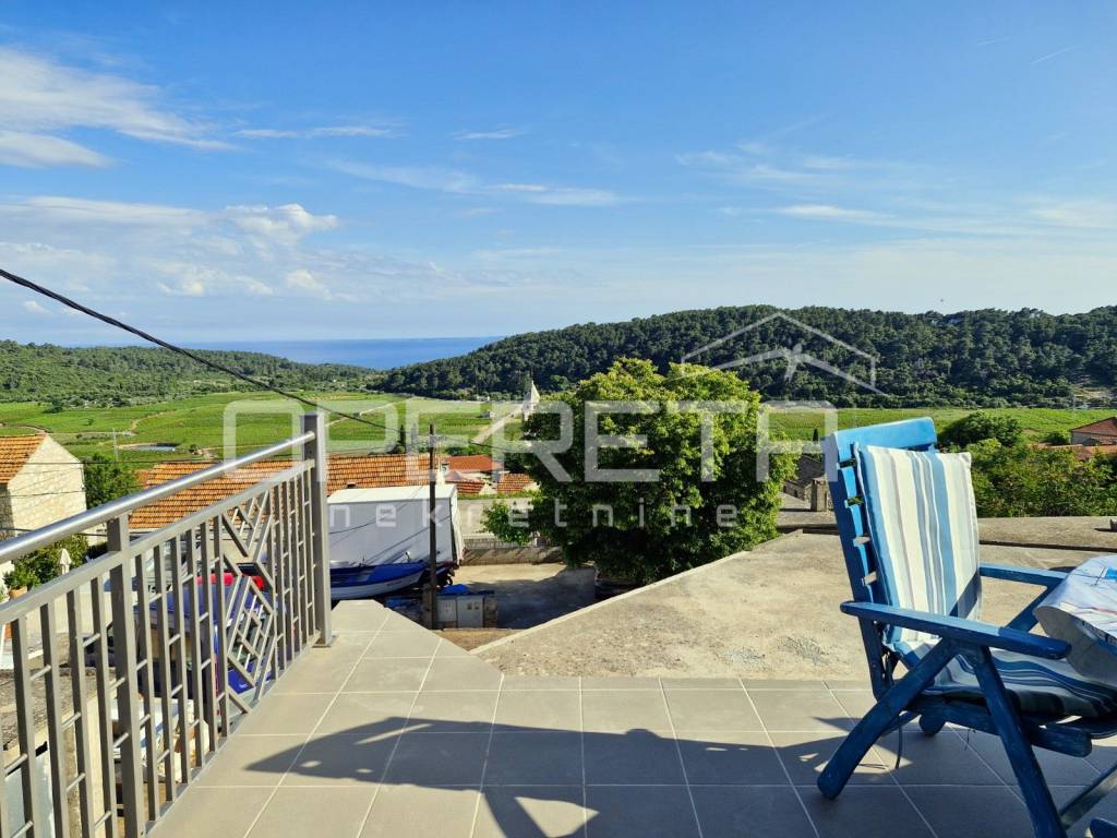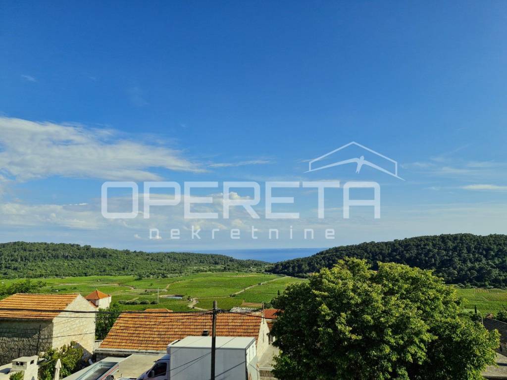 In the picturesque village of Čara, nestled in the interior of the island of Korčula, lies this renovated stone house with a captivating view of vineyards and the distant sea.