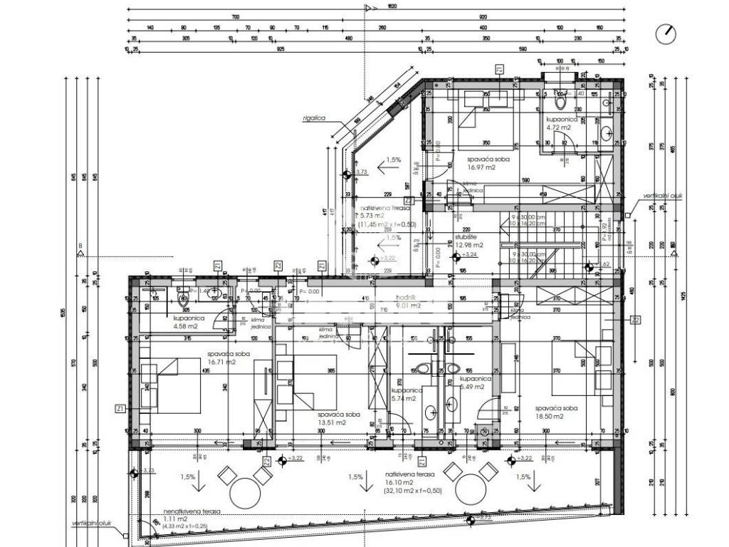 On the first floor there are 4 bedrooms, each with its own bathroom. Three bedrooms have access to a large terrace with a panoramic view of the sea and nature.