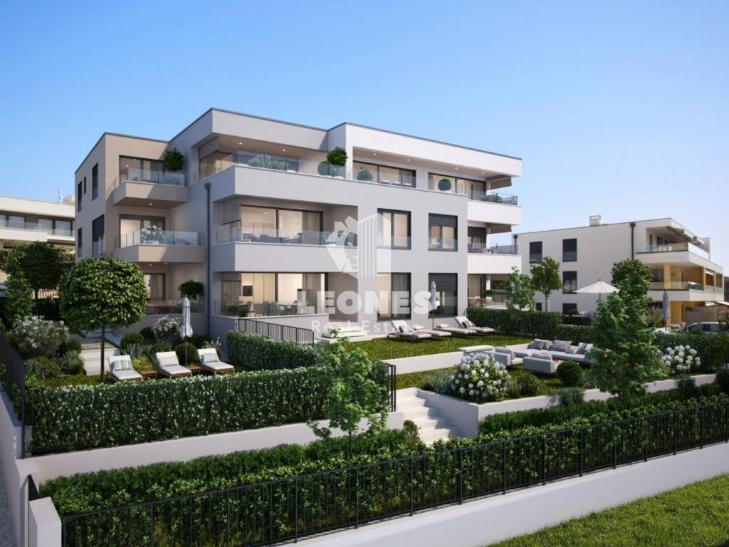 Apartment in a new building with a garden and a view of the sea in a prime location in Novigrad