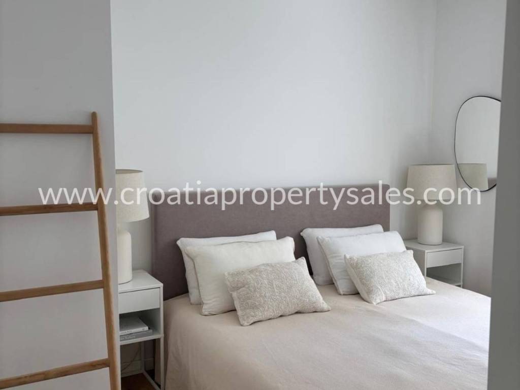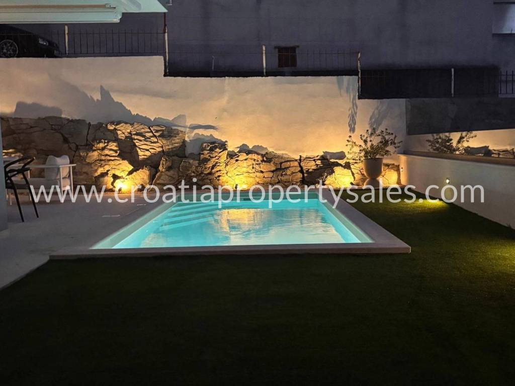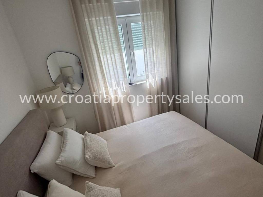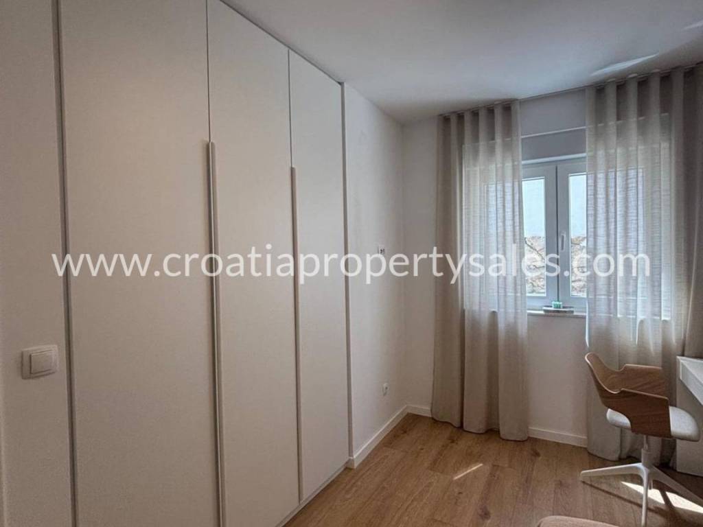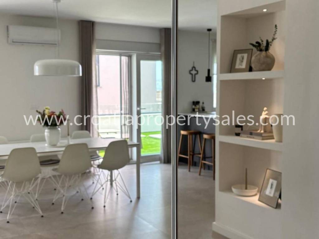 An attractive ground floor apartment of a small building of only 3 apartments, ideal for a pleasant family life or use as a quiet place for refuge. The apartment has 90 m2 of living space and an additional 16 m2 of terrace that naturally continues onto a spacious private garden of 200 m2, creating a perfect connection between the interior and exterior. Within the garden there is a private swimming pool measuring 3X6 m equipped with a modern engine room with automation and hydrolysis, which ensures easy and high-quality maintenance. The interior of the apartment consists of 3 bedrooms, one bathroom and an additional toilet, while the kitchen, living room and dining room are connected in an open, bright and functional concept. The apartment provides a high level of comfort and privacy, and the exterior with a swimming pool provides the atmosphere of a real family home with a touch of Mediterranean relaxation.