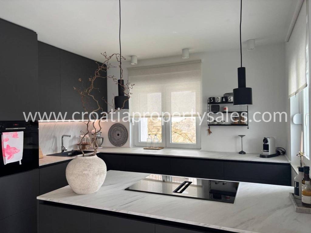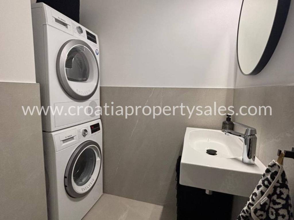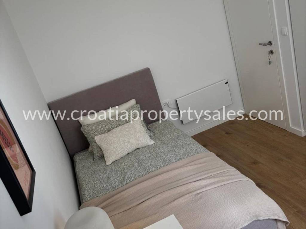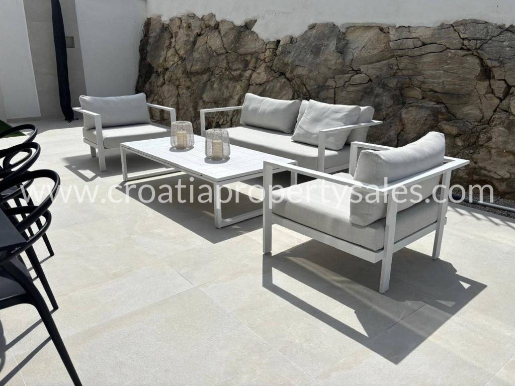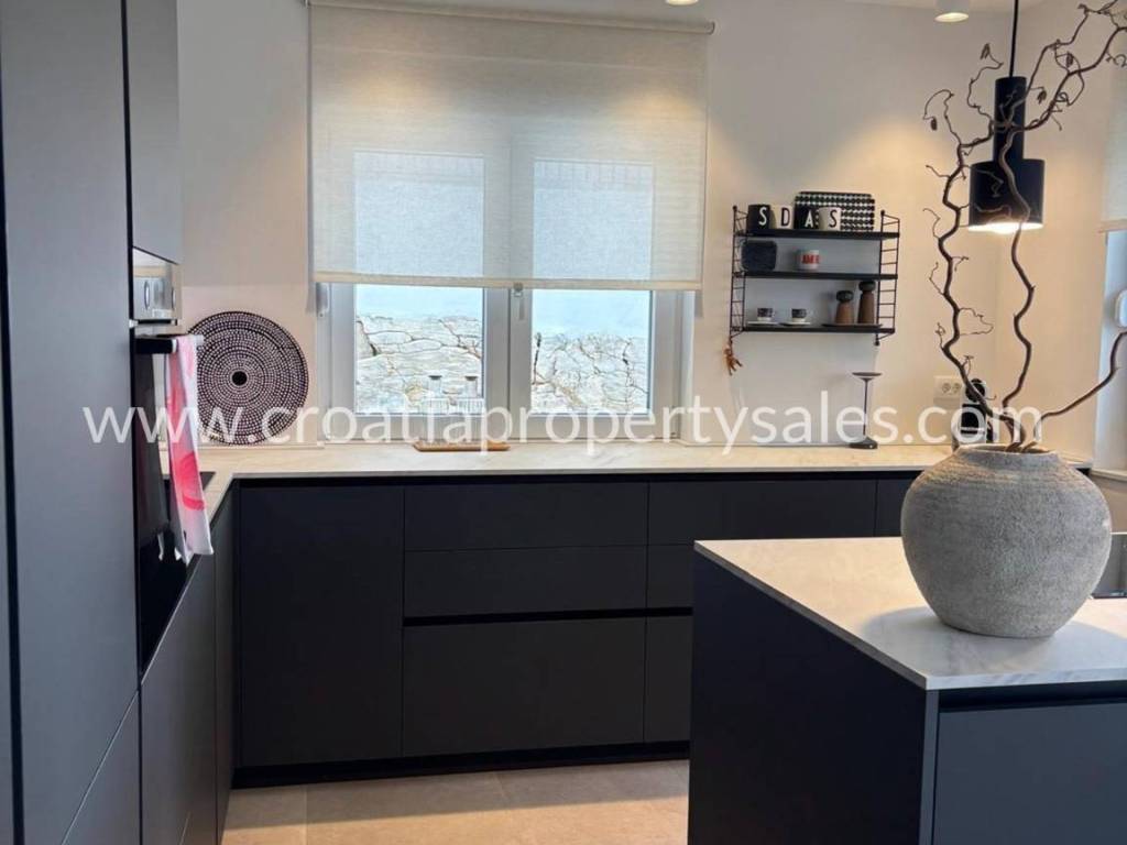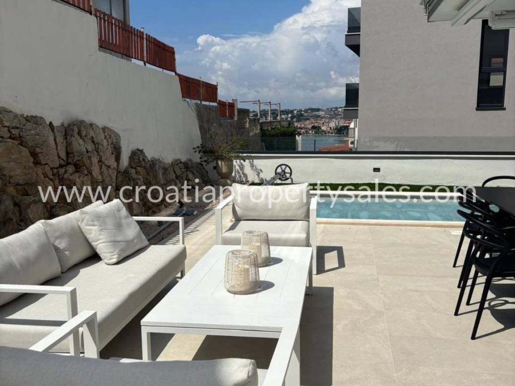 An attractive ground floor apartment of a small building of only 3 apartments, ideal for a pleasant family life or use as a quiet place for refuge. The apartment has 90 m2 of living space and an additional 16 m2 of terrace that naturally continues onto a spacious private garden of 200 m2, creating a perfect connection between the interior and exterior. Within the garden there is a private swimming pool measuring 3X6 m equipped with a modern engine room with automation and hydrolysis, which ensures easy and high-quality maintenance. The interior of the apartment consists of 3 bedrooms, one bathroom and an additional toilet, while the kitchen, living room and dining room are connected in an open, bright and functional concept. The apartment provides a high level of comfort and privacy, and the exterior with a swimming pool provides the atmosphere of a real family home with a touch of Mediterranean relaxation.