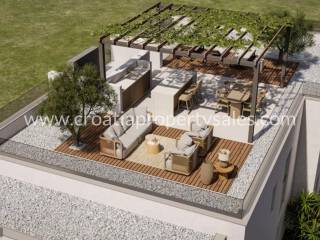 Apt 3 - 88 m2 consists of an entrance hallway, kitchen and dining area with a living room, two bedrooms, bathroom, wc, balcony (16 m2), and a private roof terrace (60 m2) with beautiful views out to the sea and bay - 309,000 eur