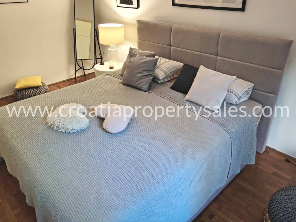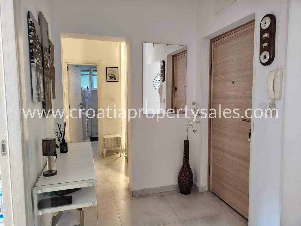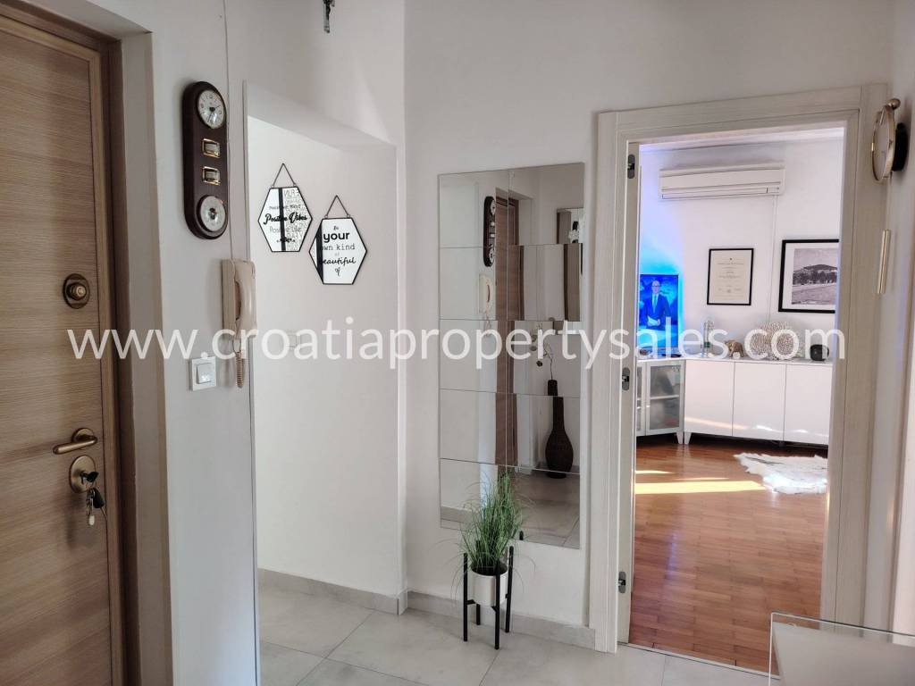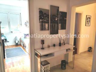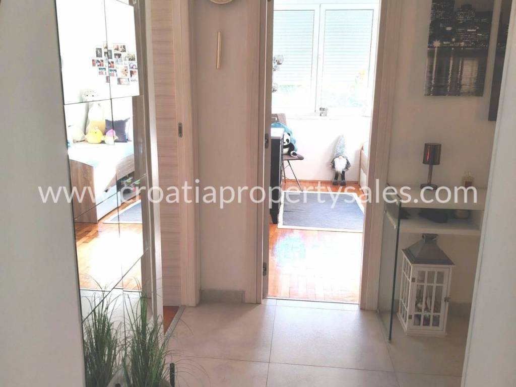 Two-bedroom apartment on the first floor of a small building in a beautiful location. The apartment is 78 m2 and consists of an entrance hall, two bedrooms, a bathroom, a spacious living room and a kitchen with a dining room. The kitchen and living room lead out to a large south-facing balcony. The apartment is modernly furnished, completely renovated in 2020., and illuminated. It is possible to park in front of the entrance. The center is only a 10-minute walk away, and the sandy beach is 500 m away.