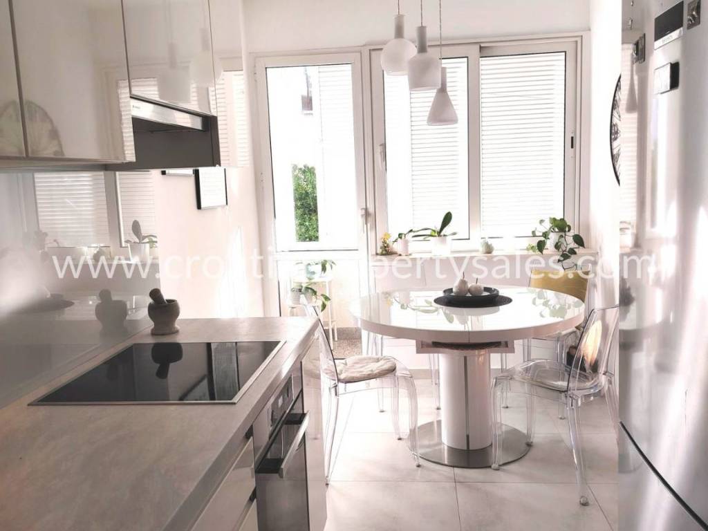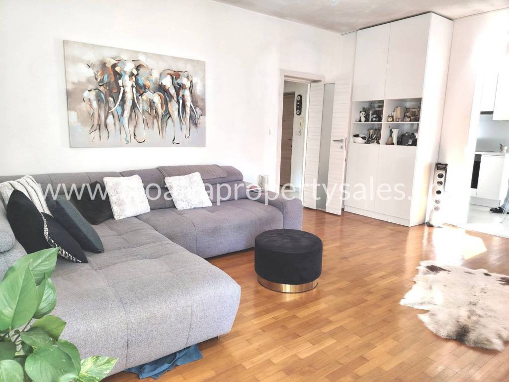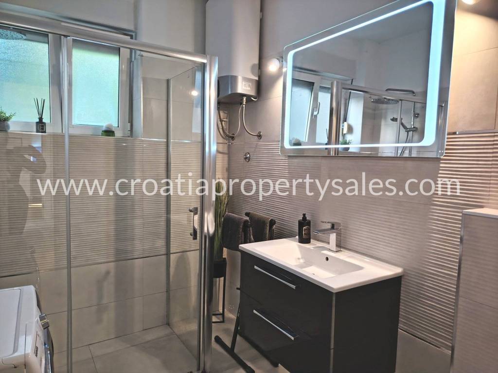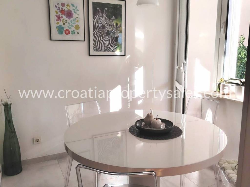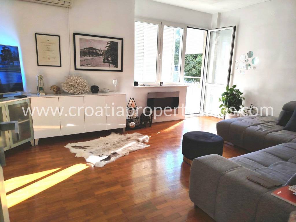 Two-bedroom apartment on the first floor of a small building in a beautiful location. The apartment is 78 m2 and consists of an entrance hall, two bedrooms, a bathroom, a spacious living room and a kitchen with a dining room. The kitchen and living room lead out to a large south-facing balcony. The apartment is modernly furnished, completely renovated in 2020., and illuminated. It is possible to park in front of the entrance. The center is only a 10-minute walk away, and the sandy beach is 500 m away.