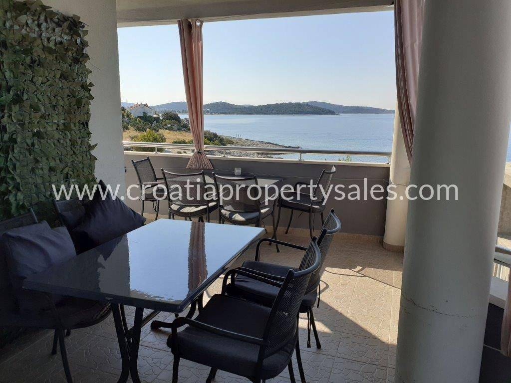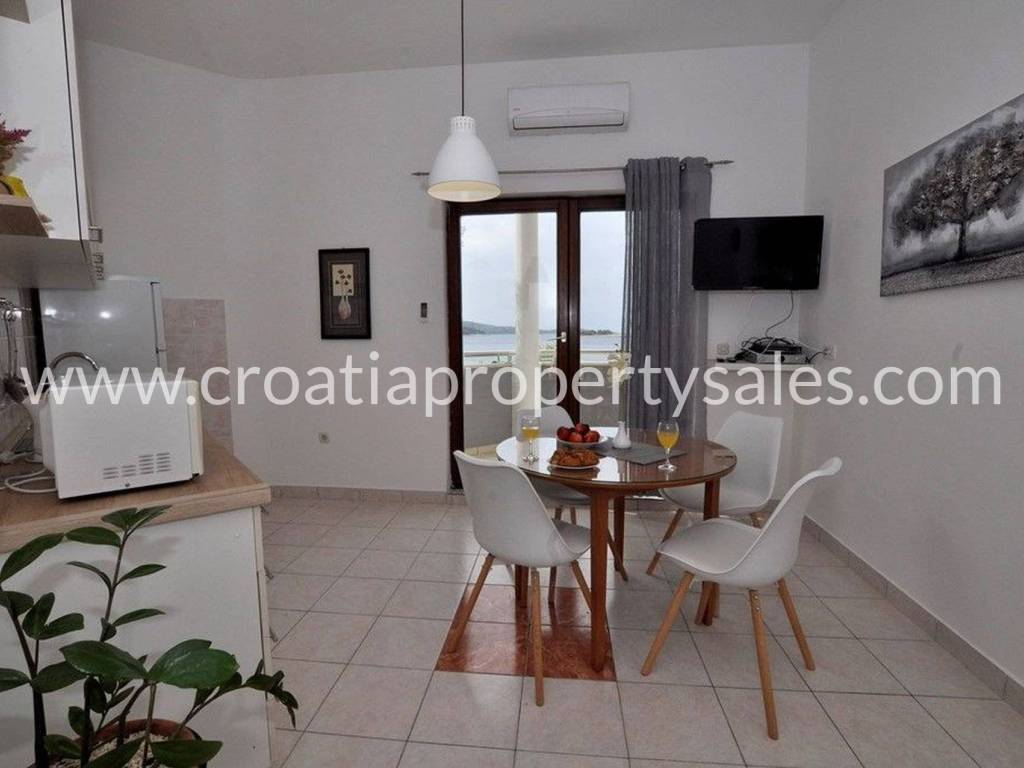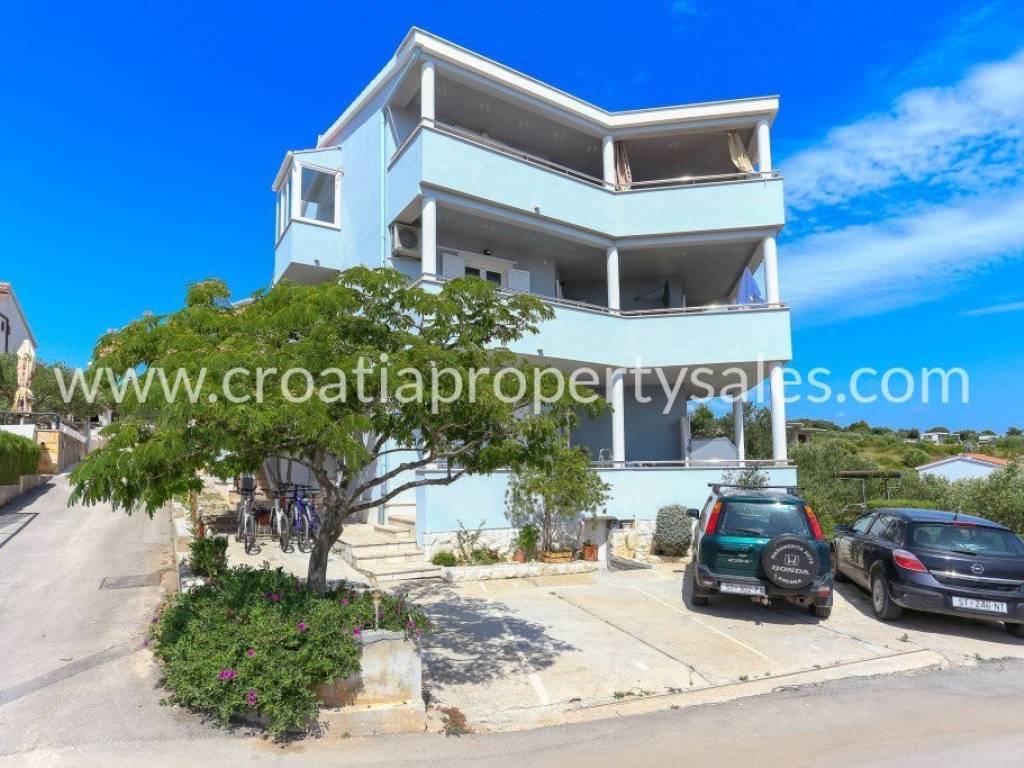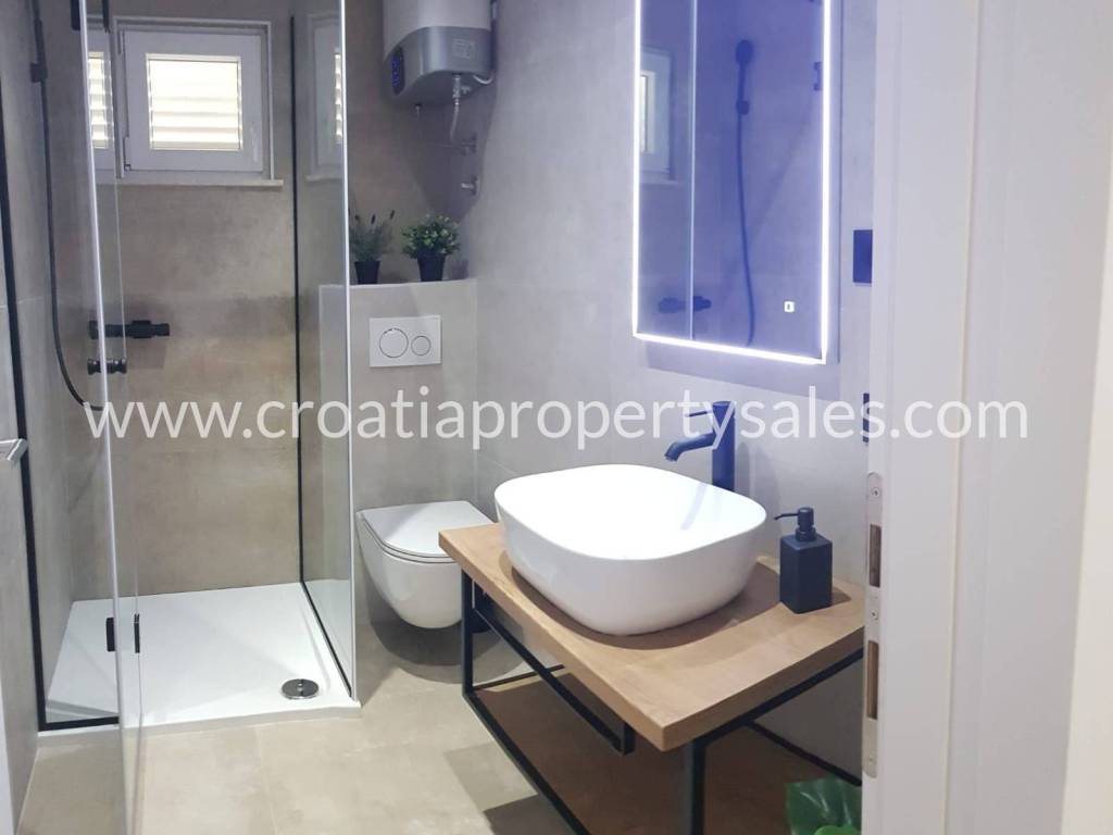 Charming house located near Rogoznica and in the immediate vicinity of a pebble beach. The house consists of 4 apartments, two of which are on the ground floor, one on the first floor, and one on the second floor. For sale within this property are the ground floor and the first floor. Ground floor - 320,000 euros-consists of two apartments, the first apartment is one-bedroom (34.18 m2 + terrace), while the second is two-bedroom (41.34 + terrace) First floor - Sold-consists of a three-room apartment (75.15 m2 + terrace 24.79 m2). Currently, the apartment is divided into two apartments (one and two bedroom) The microlocation of the property is excellent because it is located next to a small beach, while the center of Rogoznica itself is only 3.5 km from the property.