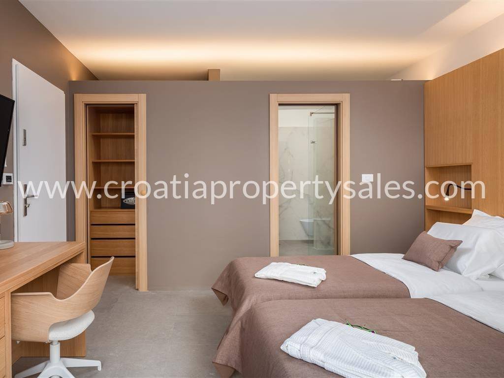 On the 2nd floor there is a spacious living room and fully equipped kitchen with toilet, 3 luxury rooms with en-suite bathroom. Each room has its own courtyard whose floor is covered with white pebbles. On the second floor there is also a large pool measuring 18x 3.8 m, 1.5 m deep. At the northern end of the pool there is a hydromassage bench for three people. The sunbathing area by the pool extends to 89 m2 and is covered to external influences with resistant Siberian larch wood.
