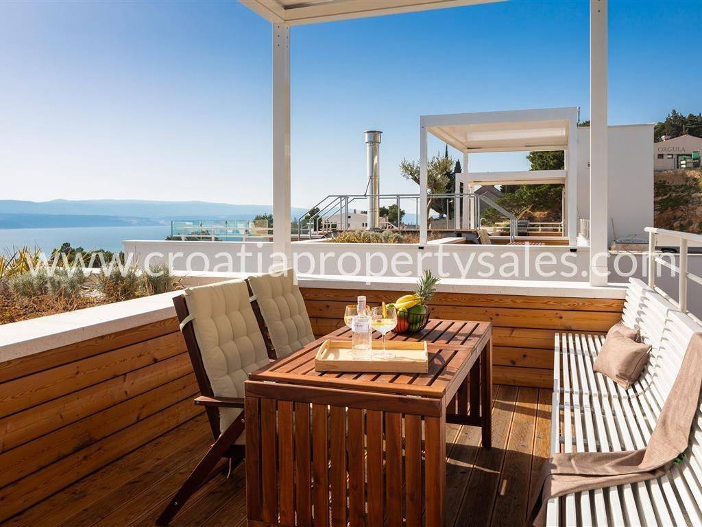 The roof terrace offers a spectacular and unobstructed view of the islands of Brac, Hvar and Korcula and the entire Makarska Riviera. On the roof terrace, which has 93 m2, there is a summer kitchen with gas grill, stone sink, mini fridge, ice maker, dining table for eight people and additional space for socializing and sunbathing.