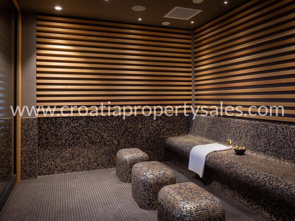On the 1st floor there is a wellness that includes an exclusive experience shower, hammam and sauna from the renowned manufacturer Effegibi, hydromassage jacuzzi for 6 people, relaxation room and gym with treadmill, exercise bike and multifunctional device and a spacious closed balcony of 28,5 m2.