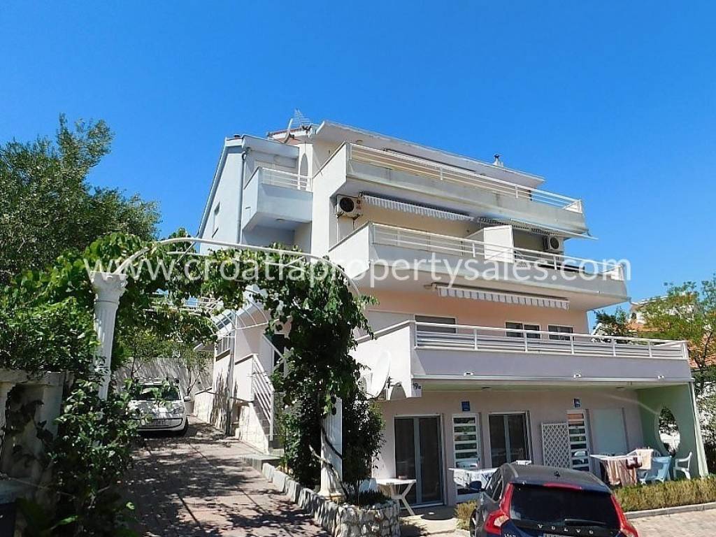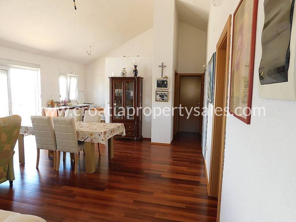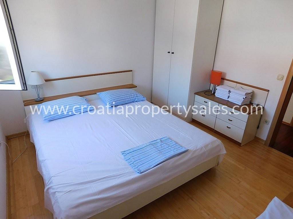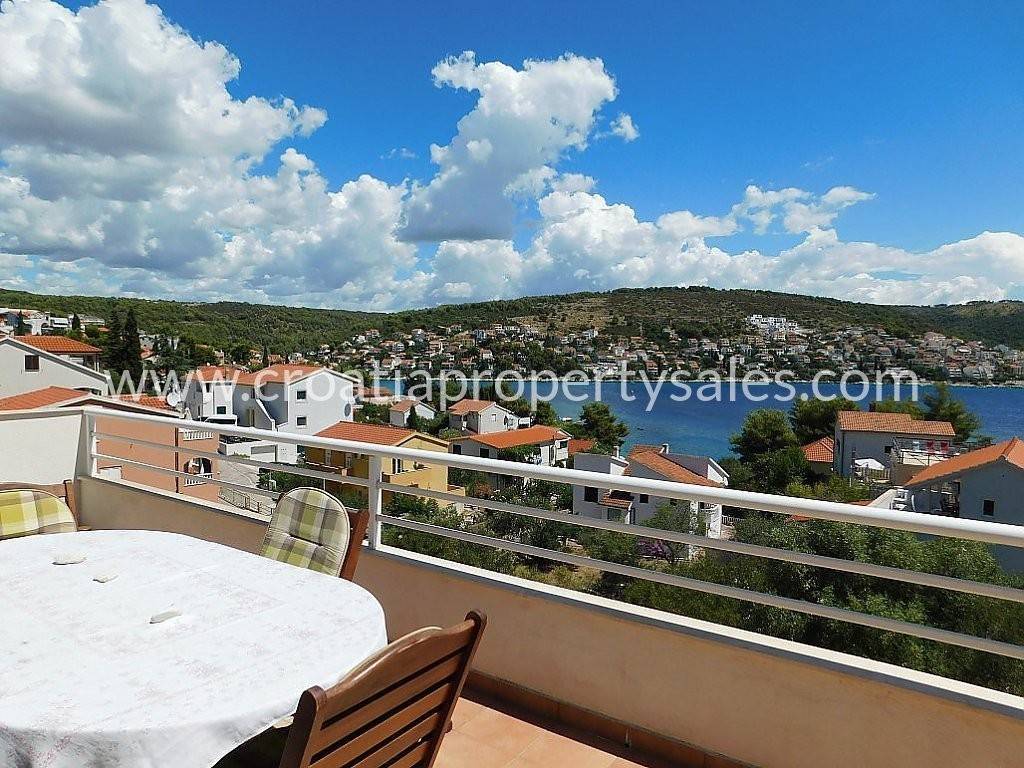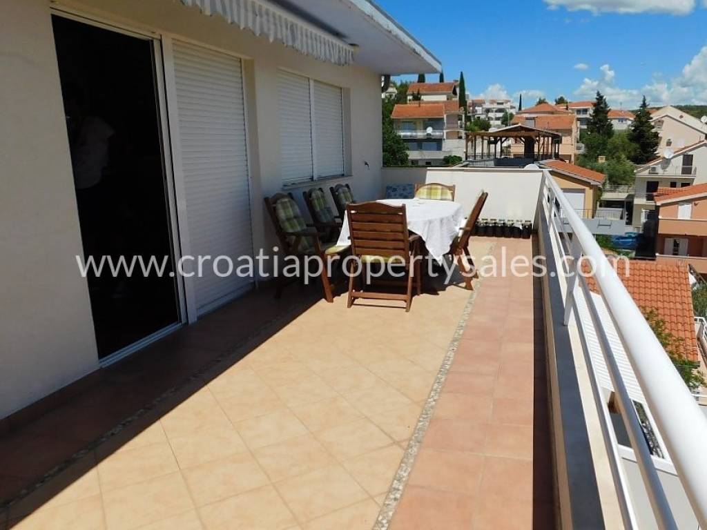 We are happy to offer this beautiful apartment situated in an attractive location only a few minutes from a lovely pebble beach. It is located near all amenities in a small center of Okrug. It is fully furnished and ready to move in, whether for private use or renting to tourists. It is a very peaceful area and even though the apartment is located in one of the most attractive areas on Ciovo. The whole apartment has 96sqm, with a big balcony of 40sqm which has a marvelous view of the sea and nearby islands. It has 3 bedrooms, 2 bathrooms, kitchen and a spacious living area that has a lot of natural light throughout the day. There is one parking space in front of the building. Trogir is only 10 minutes drive away and the international airport is 20 minutes from the property. For more information, please contact our office in Split