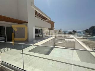 The ground floor of the villa is designed as a recreation and relaxation area with a sauna, a entertainment room, a laundry room, a bathroom, and a modern kitchen and spacious dining room perfect for enjoying Mediterranean cuisine. From the dining room and spacious living room with large glass walls, you have direct access to an open terrace with a magnificent view of the crystal clear sea and pebble beaches.