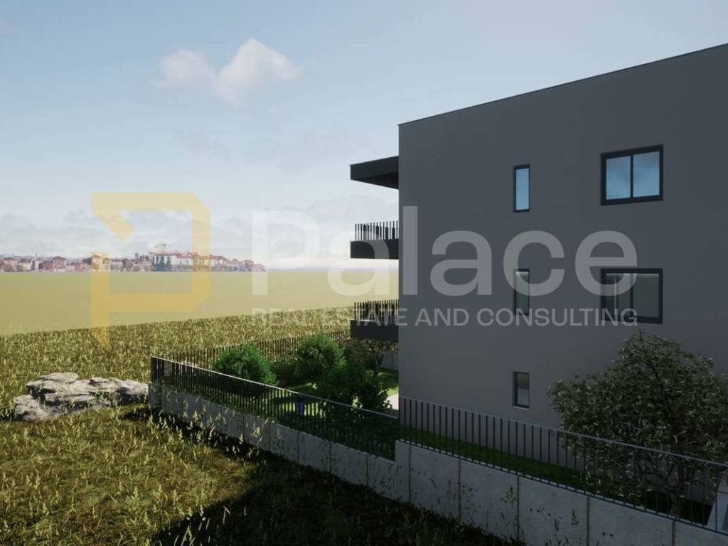 The apartment is situated on the ground floor and consists of a kitchen with a dining area and living room, two bedrooms, a hallway, an entrance hall, a bathroom, with a total area of 53.25 m, a terrace with a total area of 16.92 m, and a garden of 63 m.