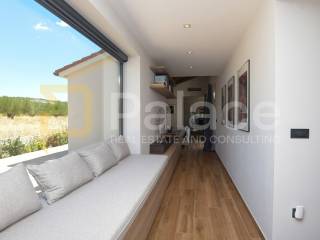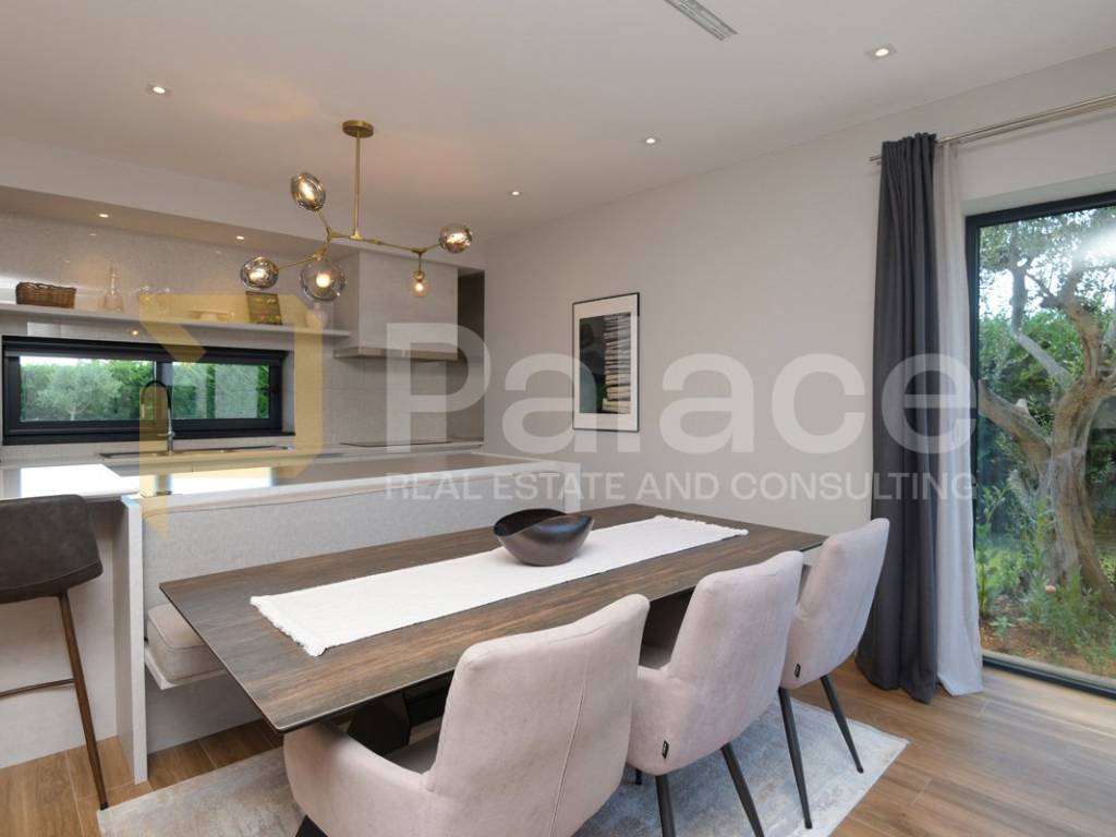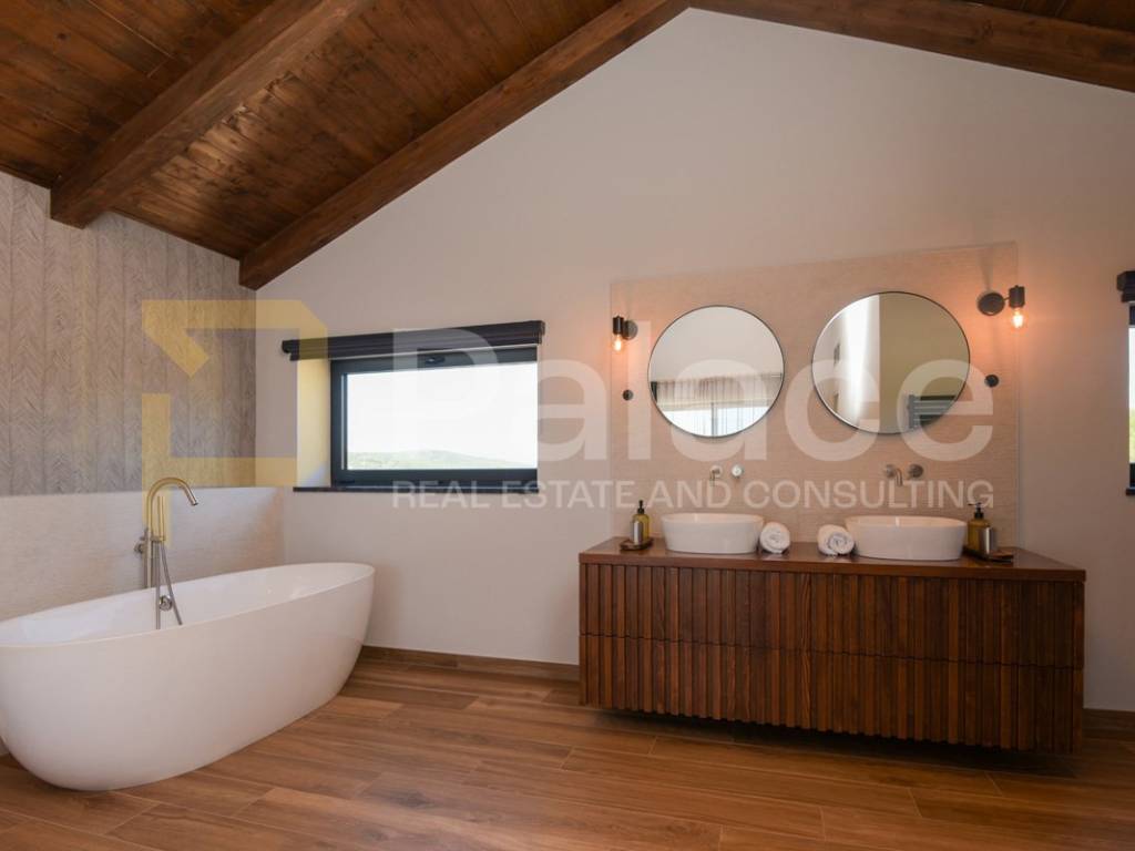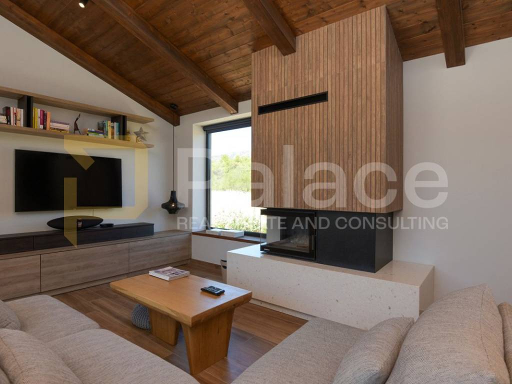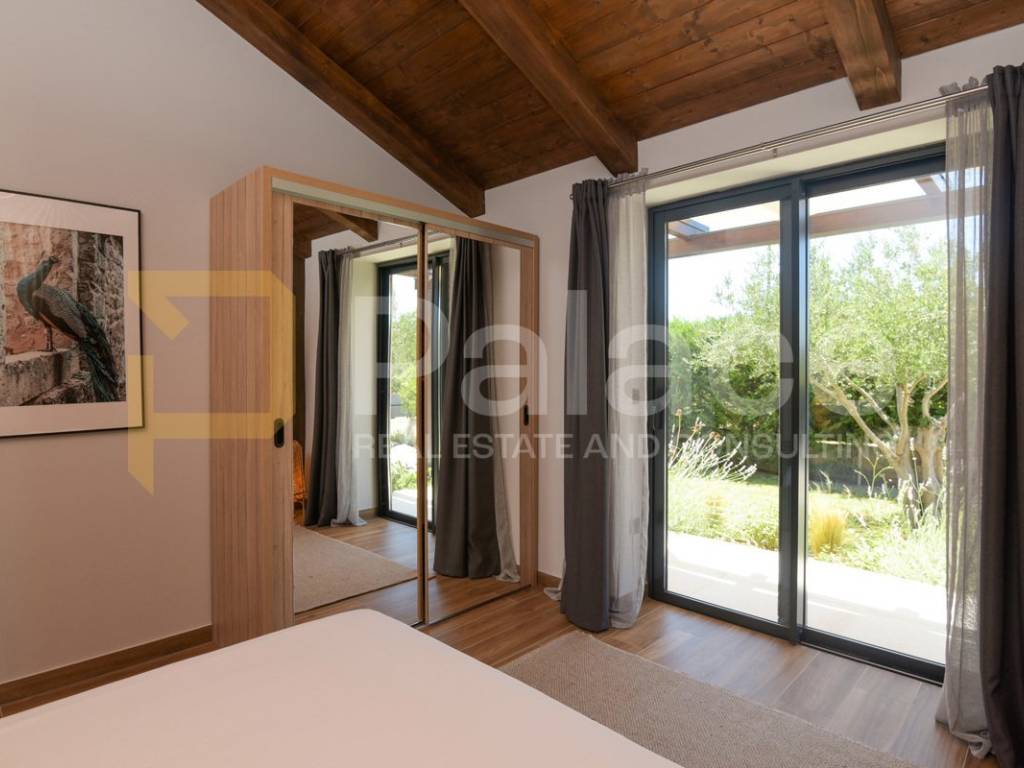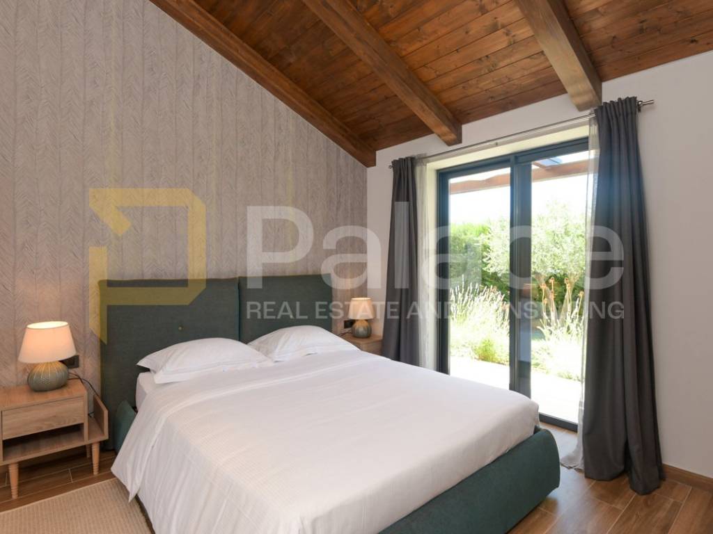 The villa has two storeys. On the ground floor it features two beautifully appointed bedrooms with shared spacious bathroom, an expansive and stylish living room with large windows and stunning views, fully equipped gourmet kitchen, as well as a spacious laundry room. It also has a utility room for HVAC and other controls, including video monitoring system, solar system, automatic irrigation and bio septic tank. Internal staircase leads to the first floor, with walk-in wardrobe and a spacious open plan bedroom with en-suite bathroom. The construction is characterised by exceptionally high quality materials such as Ytong 40 (40cm thick walls), STO facade, travertine stone and Reynaers openings. Excellent insulation allows the minimal use of energy. Additionally, the house is equipped with solar panels and a heat pump that manages underfloor heating and air conditioning, with individual controls for every room. Inside, traditional Mediterranean architecture meets contemporary design. Porcelanosa and Keraben ceramic, Crosswater taps and shower enclosures, Arte wallpapers and custom-made furniture, are all carefully selected and designed to ensure maximum comfort and luxury of living. Large kitchen is equipped with two fridge/freezers, oven, dishwasher, induction cooktop, silent Falmec hood, as well as plenty of storage. Worktop is made of high quality, 3cm Technostone quartz. Light exposure is maximized by careful space planning, while sloped ceilings and panoramic windows emphasize contact with beautiful nature that surrounds the property. The villa is surrounded by paved terraces, one intended for barbecue lovers, and the other for enjoyment by the 36m2 swimming pool. Whether you are taking a dip, sunbathing or dining al-fresco, the outdoor space is designed for relaxation and enjoyment. The 1000m2 cascading plot around the house, accommodates a large parking space, a garden with pear and fig trees, as well as centuries-old olive trees and over 40 different flower species. 115 cypress leylandii trees of 2.5m height were planted as a hedge to ensure privacy and provide additional acoustic insulation. The quiet location ensures complete relaxation with easy access to all necessary facilities, and is ideal for lovers of nature, sports and tourist attractions. The grove offers a peaceful setting for morning walks, picnics or simply unwinding under the shade of old olive trees.