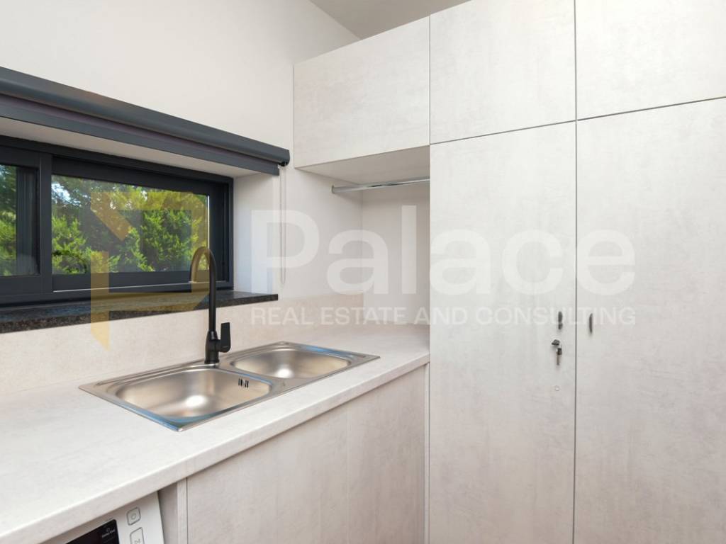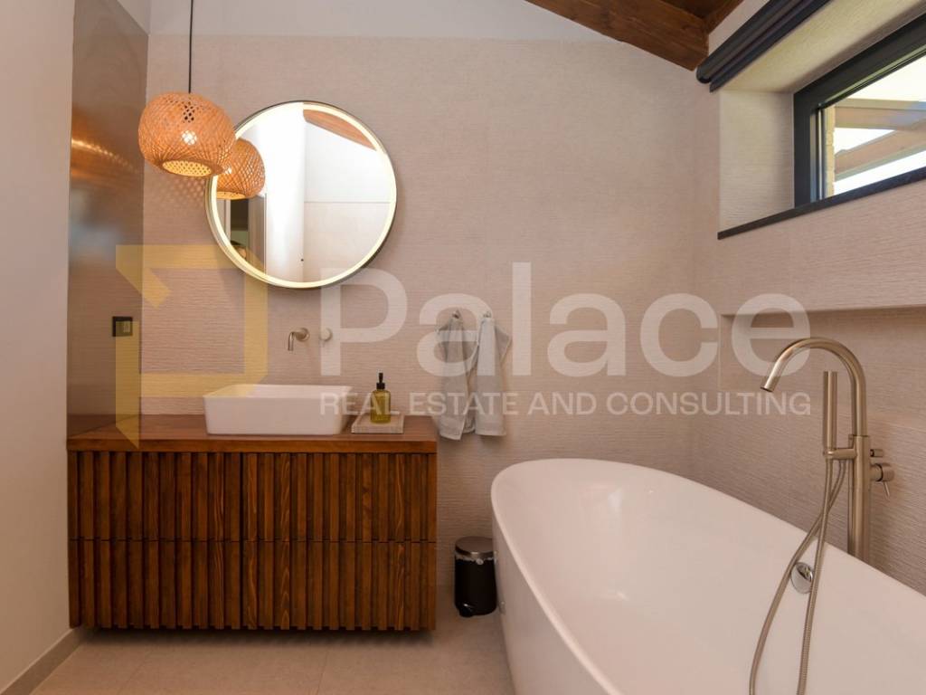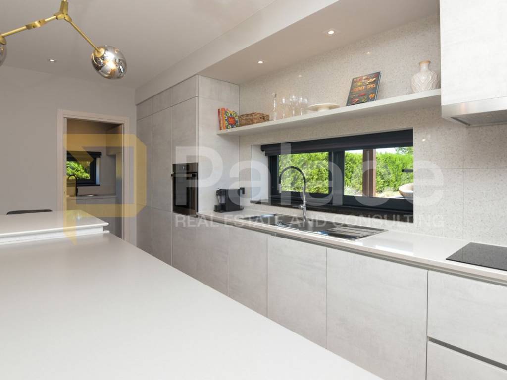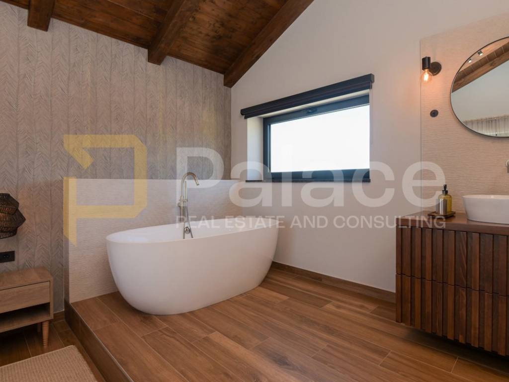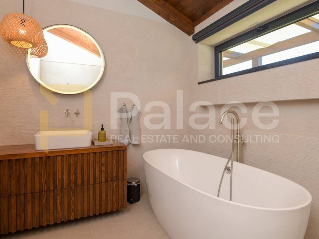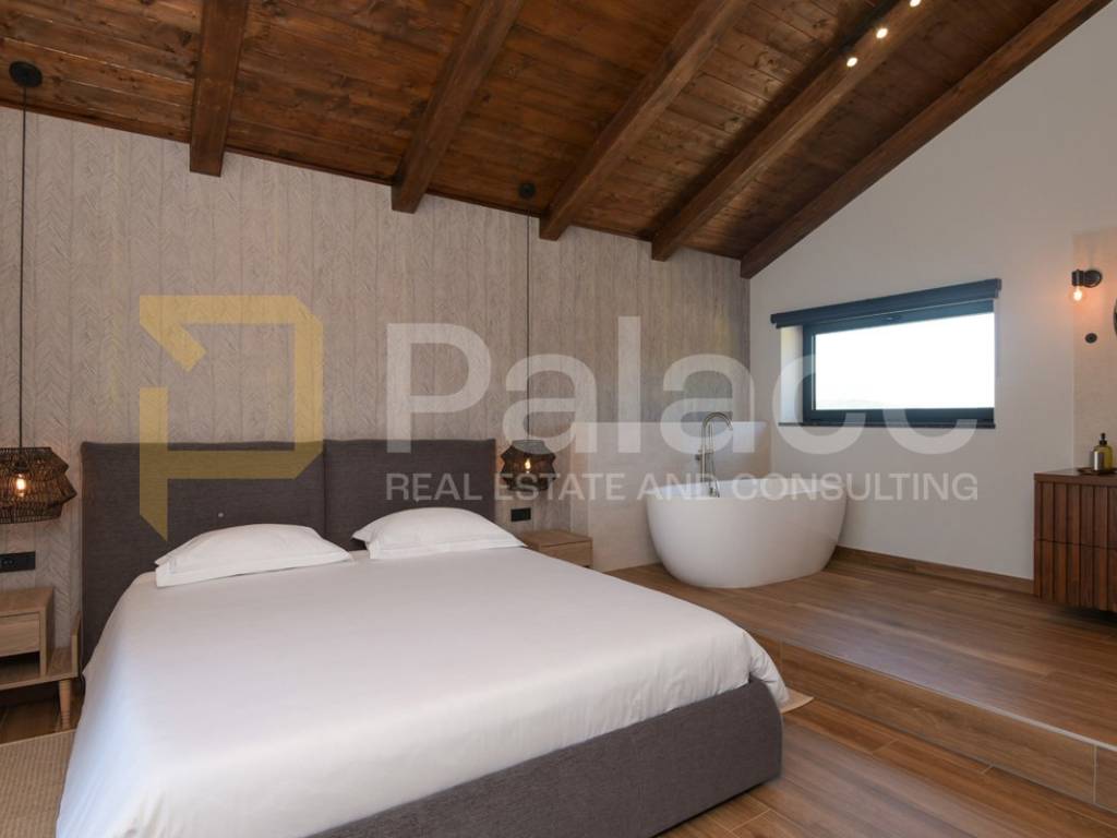 The villa has two storeys. On the ground floor it features two beautifully appointed bedrooms with shared spacious bathroom, an expansive and stylish living room with large windows and stunning views, fully equipped gourmet kitchen, as well as a spacious laundry room. It also has a utility room for HVAC and other controls, including video monitoring system, solar system, automatic irrigation and bio septic tank. Internal staircase leads to the first floor, with walk-in wardrobe and a spacious open plan bedroom with en-suite bathroom. The construction is characterised by exceptionally high quality materials such as Ytong 40 (40cm thick walls), STO facade, travertine stone and Reynaers openings. Excellent insulation allows the minimal use of energy. Additionally, the house is equipped with solar panels and a heat pump that manages underfloor heating and air conditioning, with individual controls for every room. Inside, traditional Mediterranean architecture meets contemporary design. Porcelanosa and Keraben ceramic, Crosswater taps and shower enclosures, Arte wallpapers and custom-made furniture, are all carefully selected and designed to ensure maximum comfort and luxury of living. Large kitchen is equipped with two fridge/freezers, oven, dishwasher, induction cooktop, silent Falmec hood, as well as plenty of storage. Worktop is made of high quality, 3cm Technostone quartz. Light exposure is maximized by careful space planning, while sloped ceilings and panoramic windows emphasize contact with beautiful nature that surrounds the property. The villa is surrounded by paved terraces, one intended for barbecue lovers, and the other for enjoyment by the 36m2 swimming pool. Whether you are taking a dip, sunbathing or dining al-fresco, the outdoor space is designed for relaxation and enjoyment. The 1000m2 cascading plot around the house, accommodates a large parking space, a garden with pear and fig trees, as well as centuries-old olive trees and over 40 different flower species. 115 cypress leylandii trees of 2.5m height were planted as a hedge to ensure privacy and provide additional acoustic insulation. The quiet location ensures complete relaxation with easy access to all necessary facilities, and is ideal for lovers of nature, sports and tourist attractions. The grove offers a peaceful setting for morning walks, picnics or simply unwinding under the shade of old olive trees.