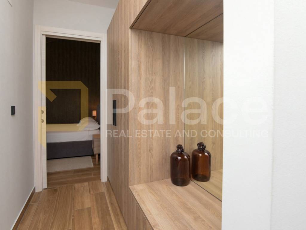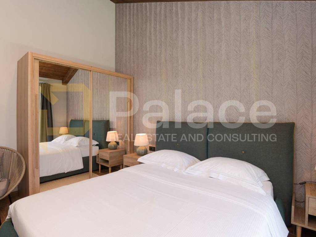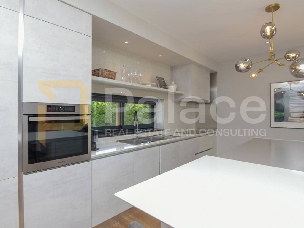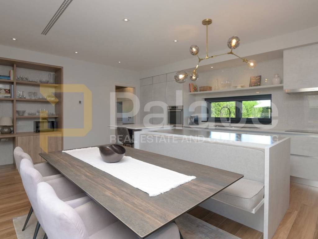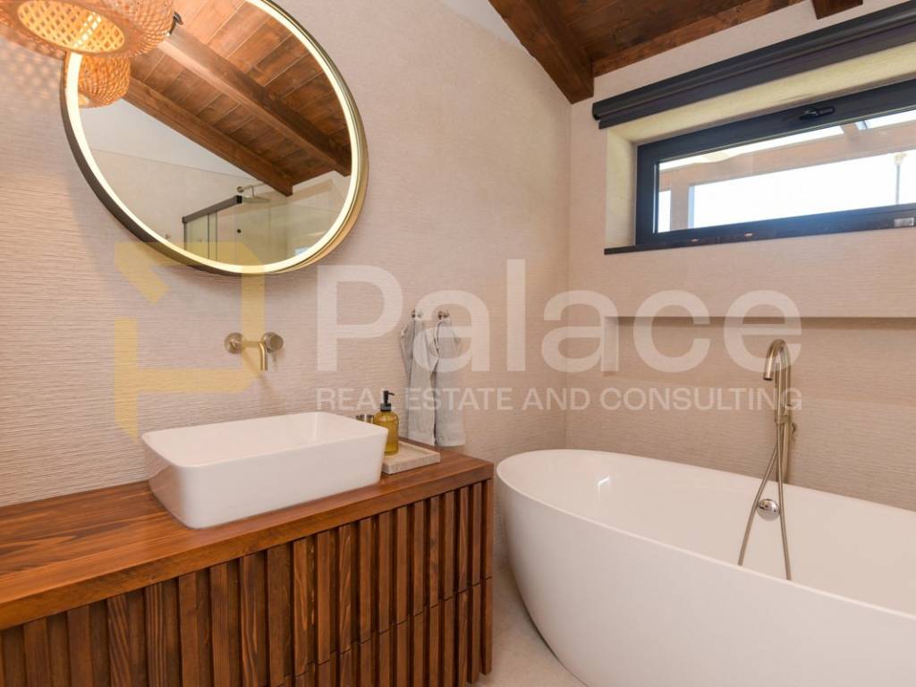 The villa has two storeys. On the ground floor it features two beautifully appointed bedrooms with shared spacious bathroom, an expansive and stylish living room with large windows and stunning views, fully equipped gourmet kitchen, as well as a spacious laundry room. It also has a utility room for HVAC and other controls, including video monitoring system, solar system, automatic irrigation and bio septic tank. Internal staircase leads to the first floor, with walk-in wardrobe and a spacious open plan bedroom with en-suite bathroom. The construction is characterised by exceptionally high quality materials such as Ytong 40 (40cm thick walls), STO facade, travertine stone and Reynaers openings. Excellent insulation allows the minimal use of energy. Additionally, the house is equipped with solar panels and a heat pump that manages underfloor heating and air conditioning, with individual controls for every room. Inside, traditional Mediterranean architecture meets contemporary design. Porcelanosa and Keraben ceramic, Crosswater taps and shower enclosures, Arte wallpapers and custom-made furniture, are all carefully selected and designed to ensure maximum comfort and luxury of living. Large kitchen is equipped with two fridge/freezers, oven, dishwasher, induction cooktop, silent Falmec hood, as well as plenty of storage. Worktop is made of high quality, 3cm Technostone quartz. Light exposure is maximized by careful space planning, while sloped ceilings and panoramic windows emphasize contact with beautiful nature that surrounds the property. The villa is surrounded by paved terraces, one intended for barbecue lovers, and the other for enjoyment by the 36m2 swimming pool. Whether you are taking a dip, sunbathing or dining al-fresco, the outdoor space is designed for relaxation and enjoyment. The 1000m2 cascading plot around the house, accommodates a large parking space, a garden with pear and fig trees, as well as centuries-old olive trees and over 40 different flower species. 115 cypress leylandii trees of 2.5m height were planted as a hedge to ensure privacy and provide additional acoustic insulation. The quiet location ensures complete relaxation with easy access to all necessary facilities, and is ideal for lovers of nature, sports and tourist attractions. The grove offers a peaceful setting for morning walks, picnics or simply unwinding under the shade of old olive trees.