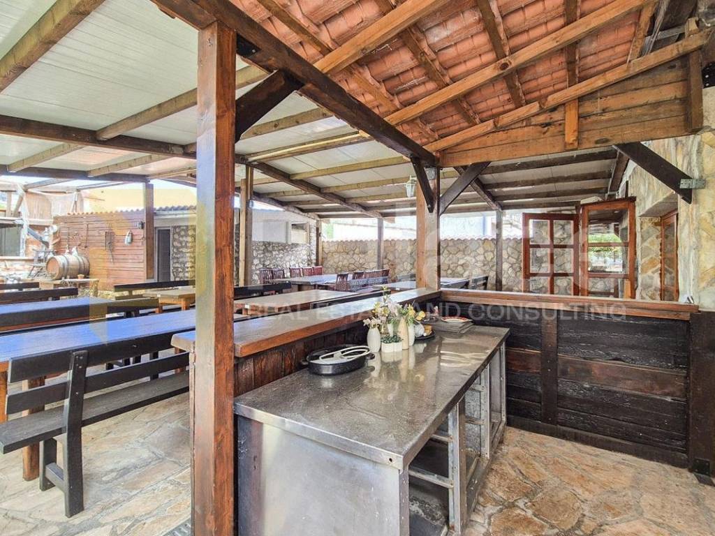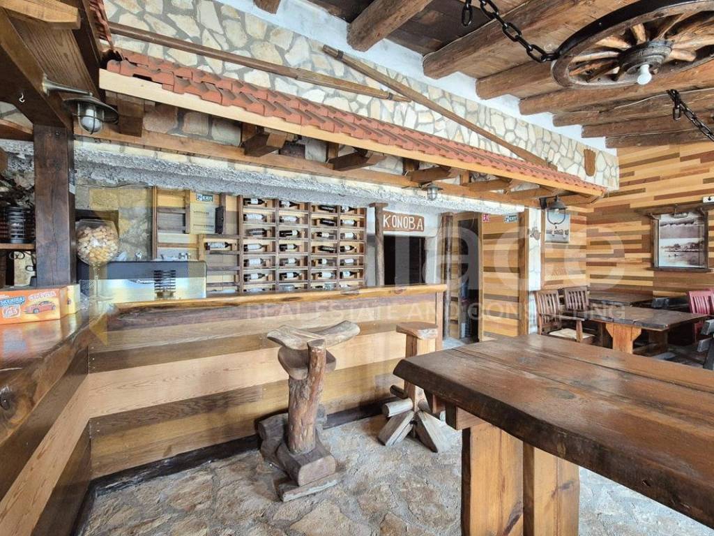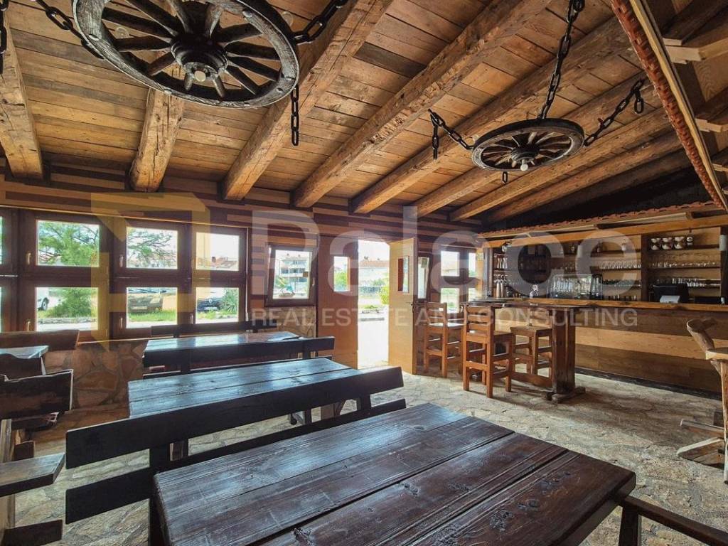On the ground floor, there is a hospitality facility - a tavern covering an area of 400 m2. It consists of an enclosed space housing a café bar, kitchen, and a small dining room for guests. In the back, there is a covered outdoor area with a bar, barbecue, tables, chairs, and a restroom for guests. The tavern has a capacity of up to 100 people and is suitable for organizing various celebrations and events.