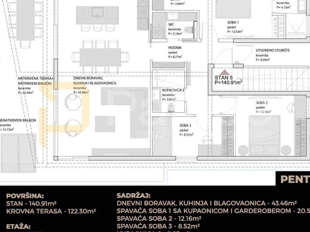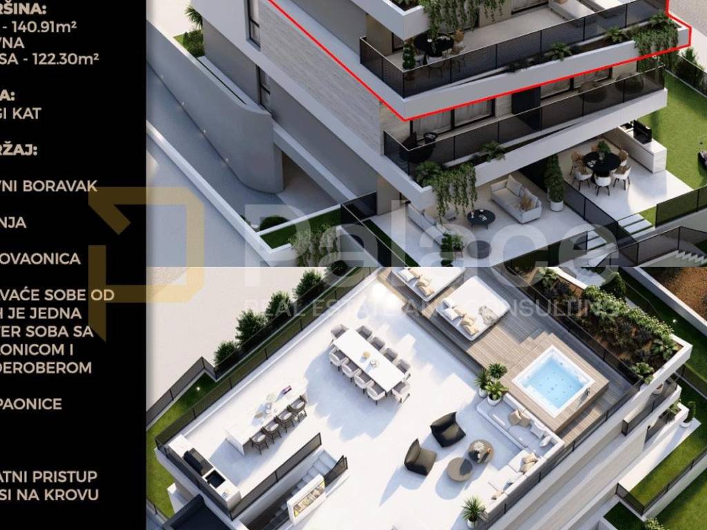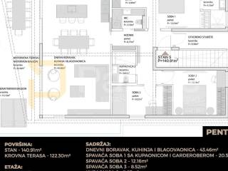 Apartment marked as S5, is situated on the second floor of a building with a total of 5 apartments. The apartment has a total net usable area of 140.91m, with the internal surface of the apartment being 91.43m, the covered terrace area of 22.44 m, and the rooftop terrace area belonging to the apartment is 122.30 m.