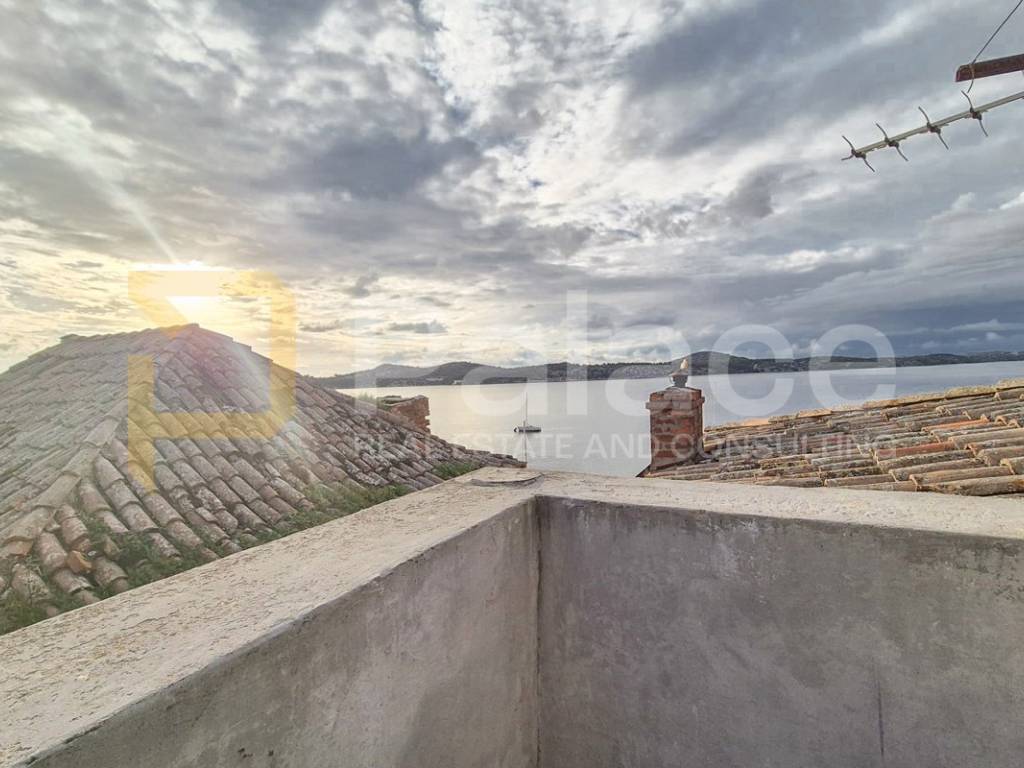 The second staircase leads to the second floor, which includes a kitchen with a dining area, a spacious living room, a modern bathroom, and a practical storage room. The apartment's special value is a spacious terrace offering a spectacular view of Šibenik, the Šibenik archipelago, and the seaa perfect place to enjoy the Dalmatian sun and relax.