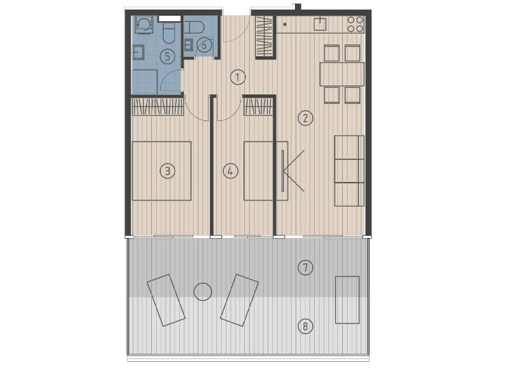 The two-bedroom apartment S402 is located on the fourth floor of the new building, with a total area of 90.55 m and includes: