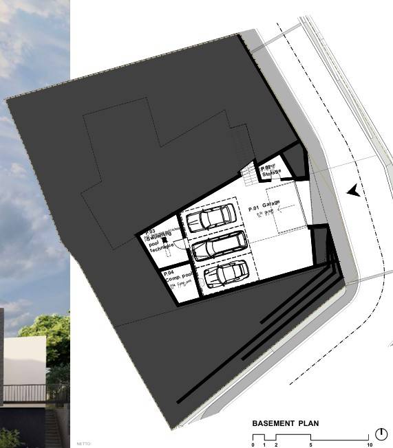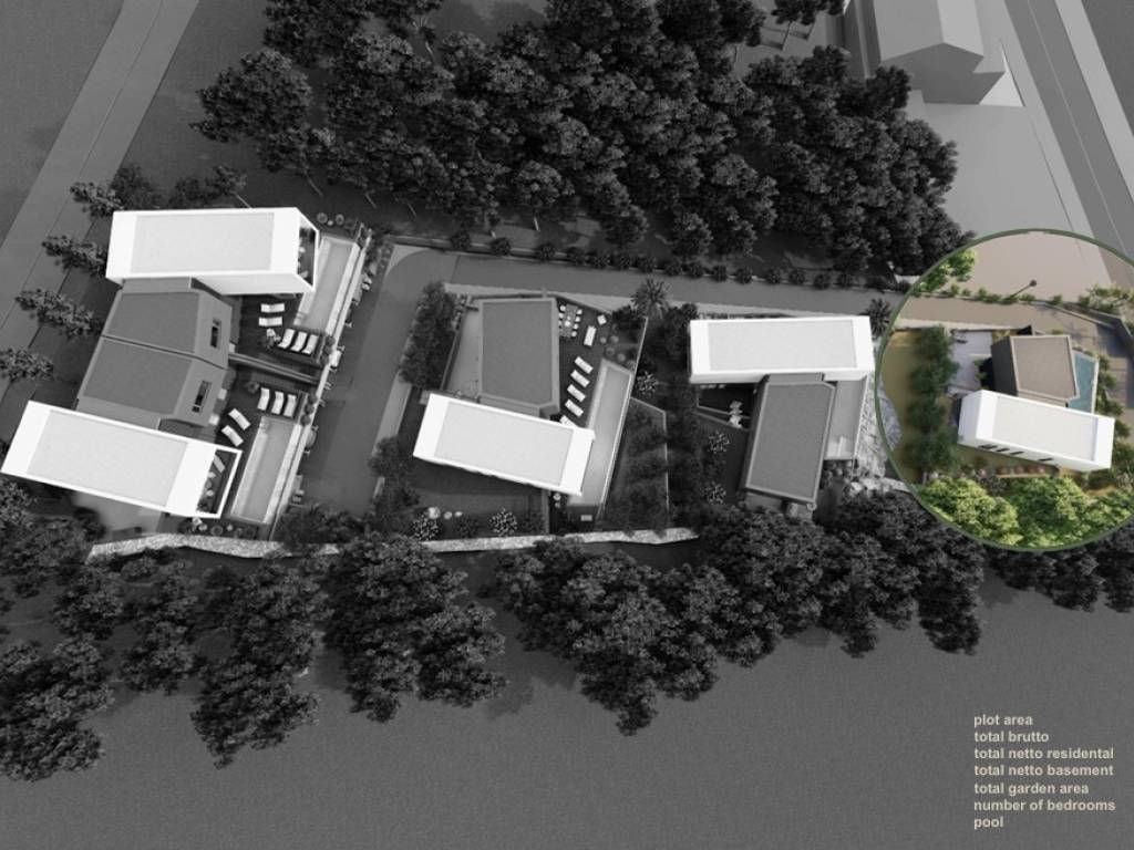 Villa "A" is the first in line and is located on a total land area of 599 m2. It consists of a basement, which also functions as a garage, a ground floor, and a flat roof.