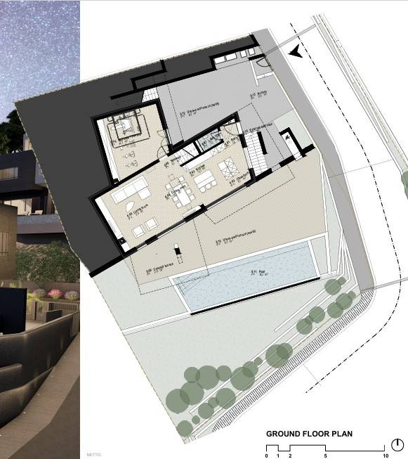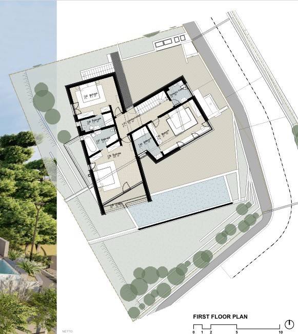 The ground floor of the villa accommodates living spaces, a covered terrace area, a north and south uncovered terrace, and a pool.