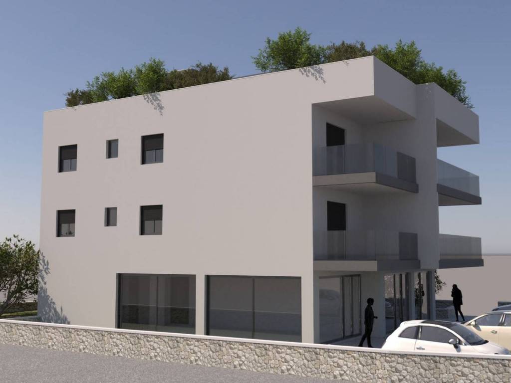 The new building is being constructed on two floors with four apartments and two commercial spaces, with the planned completion scheduled for the beginning of 2025.