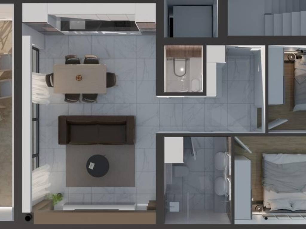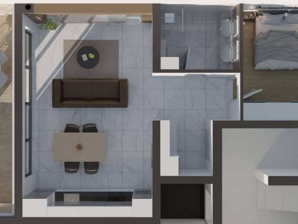 The living area of apartment S9 on the second floor is 97.03 m2, and consists of: hallway, two bedrooms, bathroom, kitchen with dining room and living room, toilet, loggia, balcony, parking space and outdoor storage. The special feature of this apartment is the roof terrace of 81.22 m2 with a panoramic view of the sea.