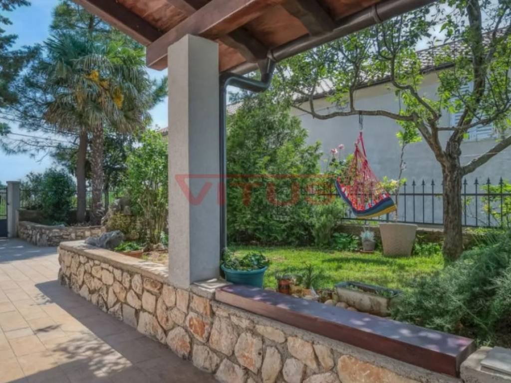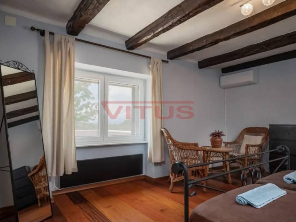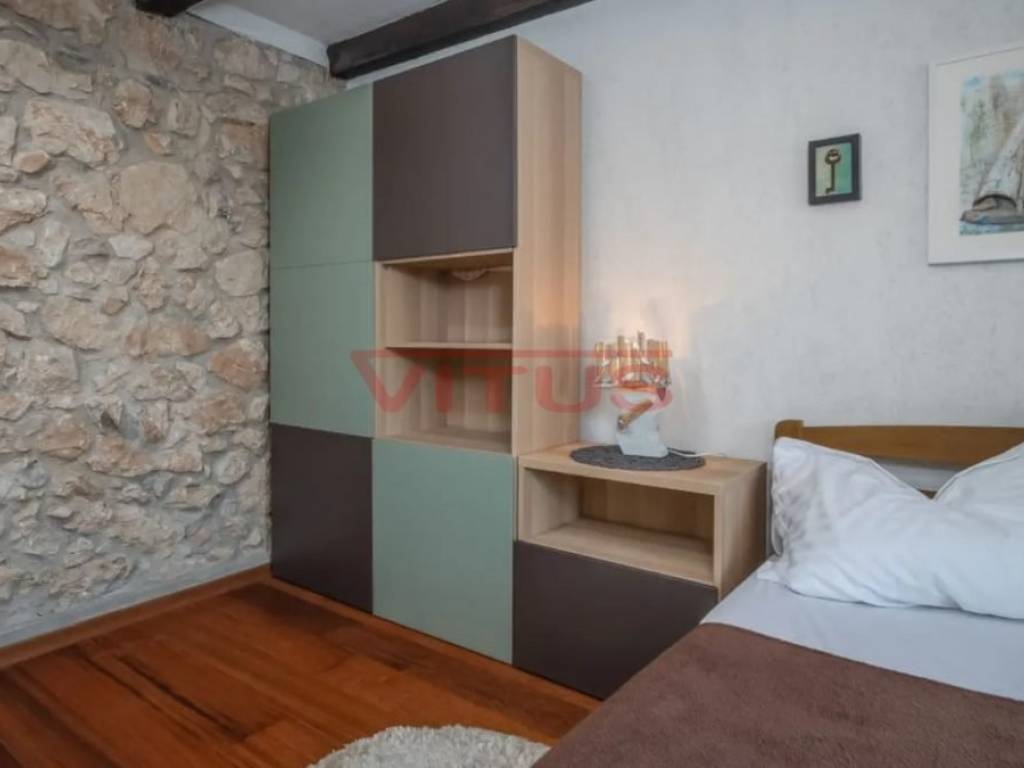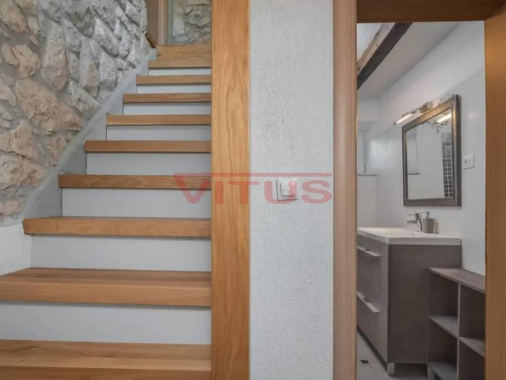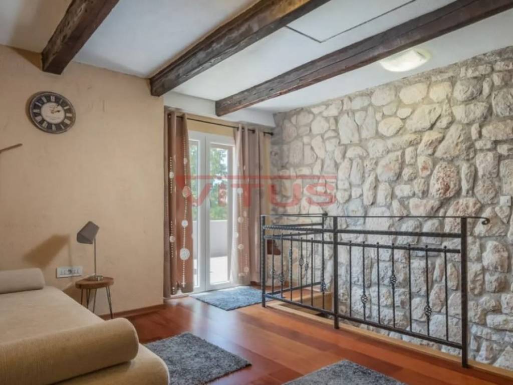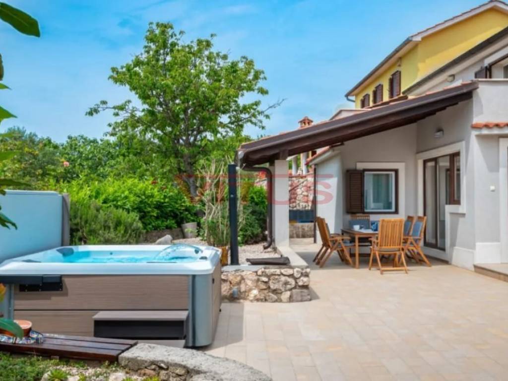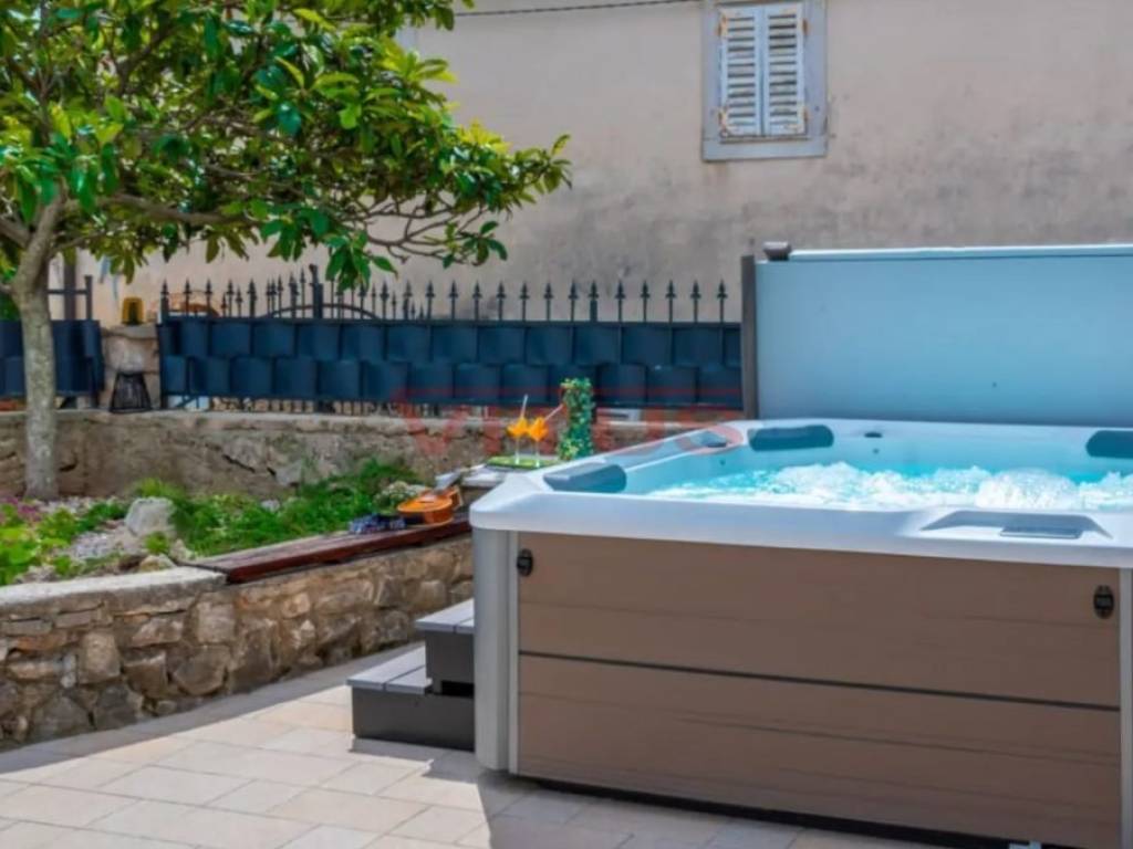 Dobrinj, island of Krk! Renovated stone semi-detached house of 169 m2 is located in a small, quiet place near Dobrinj. It consists of a ground floor and first floor containing a kitchen, living room, social area room, bathroom, two bedrooms and a spacious terrace. On the beautifully landscaped 400 m2 plot there is a covered terrace, jacuzzi and outdoor shower, while on the adjacent 270 m2 plot there are 4 parking spaces and a 20 m2 storage room. The house has been completely renovated with quality materials and equipment, emphasizing Mediterranean rusticity. In addition to standard air conditioning, heating is available using electric radiators and wood-burning stove, ensuring a comfortable stay throughout the year. The house is sold fully furnished and equipped and is categorized for tourist rental. It is located in a quiet location, 4000 m from the sea.